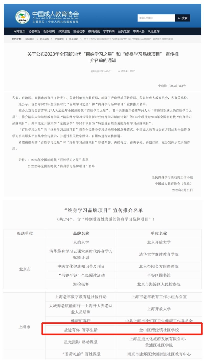 近日,由全国全民终身学习活动周工作小组、中国成人教育协会评定,金山区漕泾镇社区学校申报的《盐途有你 智享生活》获评2023年全国新时代“终身学习品牌项目”。