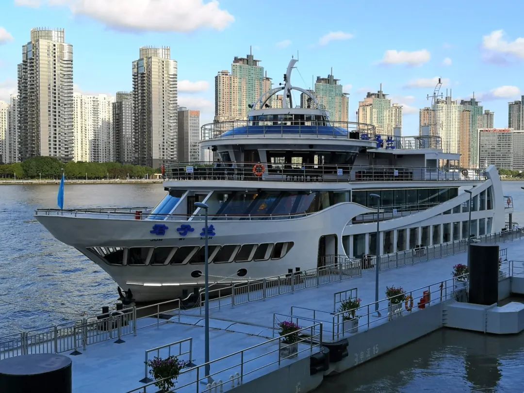 游船整体融合了现代工业造型元素和特有的海派文化内涵。客舱内部装修豪华、典雅。入夜,游船的室外装饰与舱室内灯光的外透,勾画出该船优美的造型。
