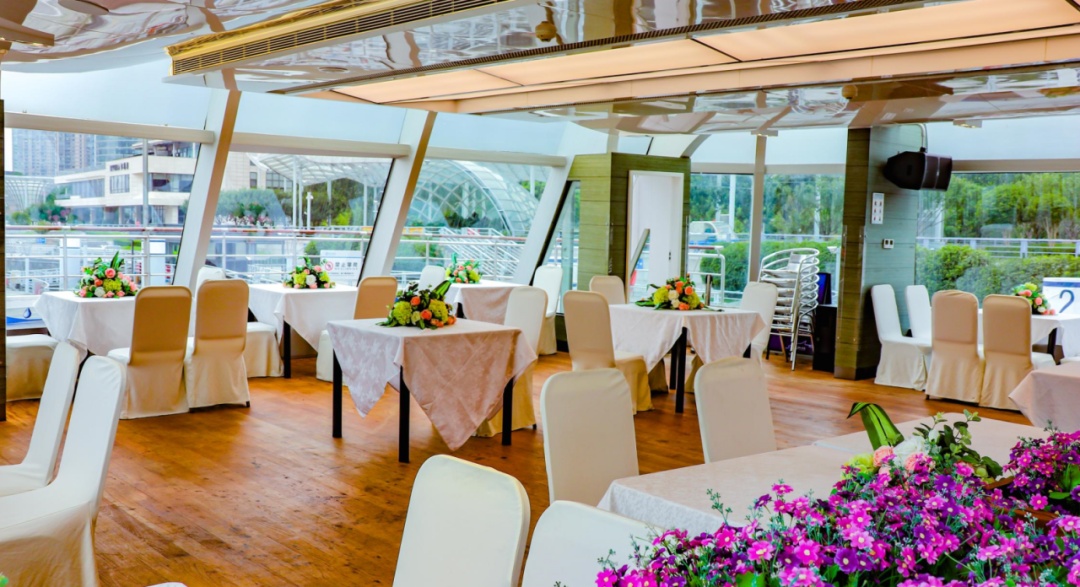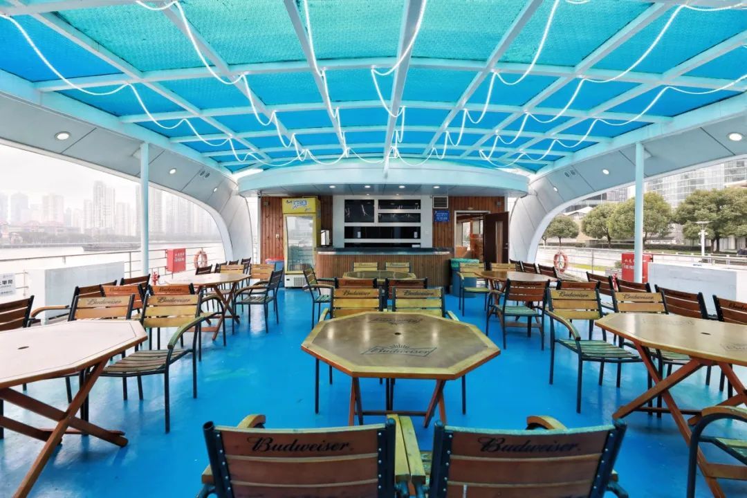 “浦江游览3号”是黄浦江上具通透性的游船,船体共3层,1、2层为舱室,3层为阳光甲板全船晶莹剔透,仿佛一颗璀璨的钻石。整个客舱内不设支柱,宽敞明亮,一览无余。