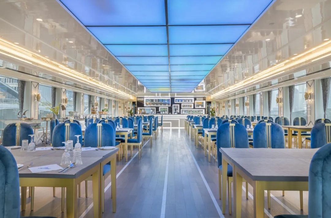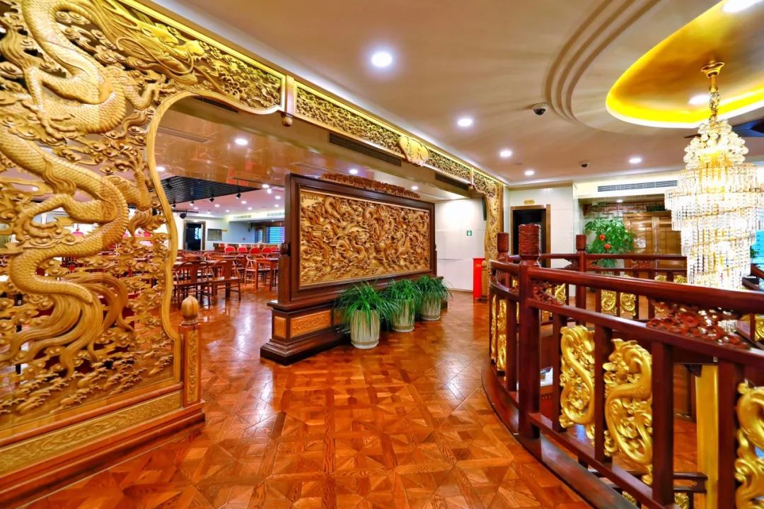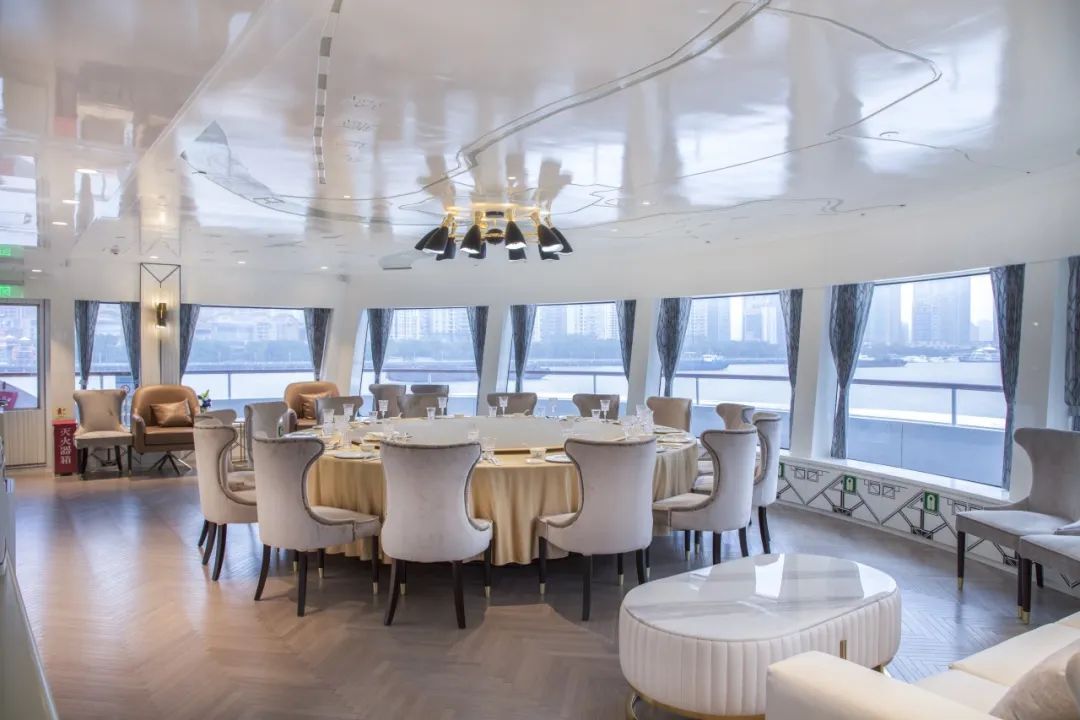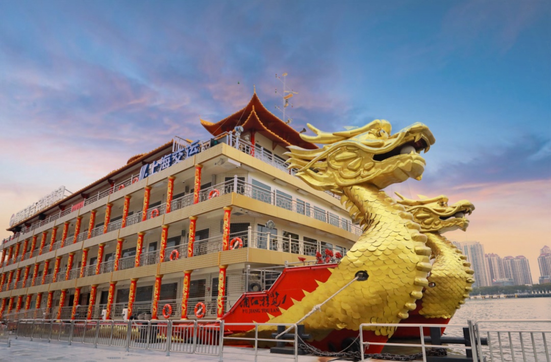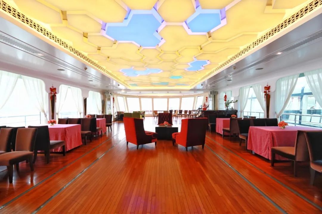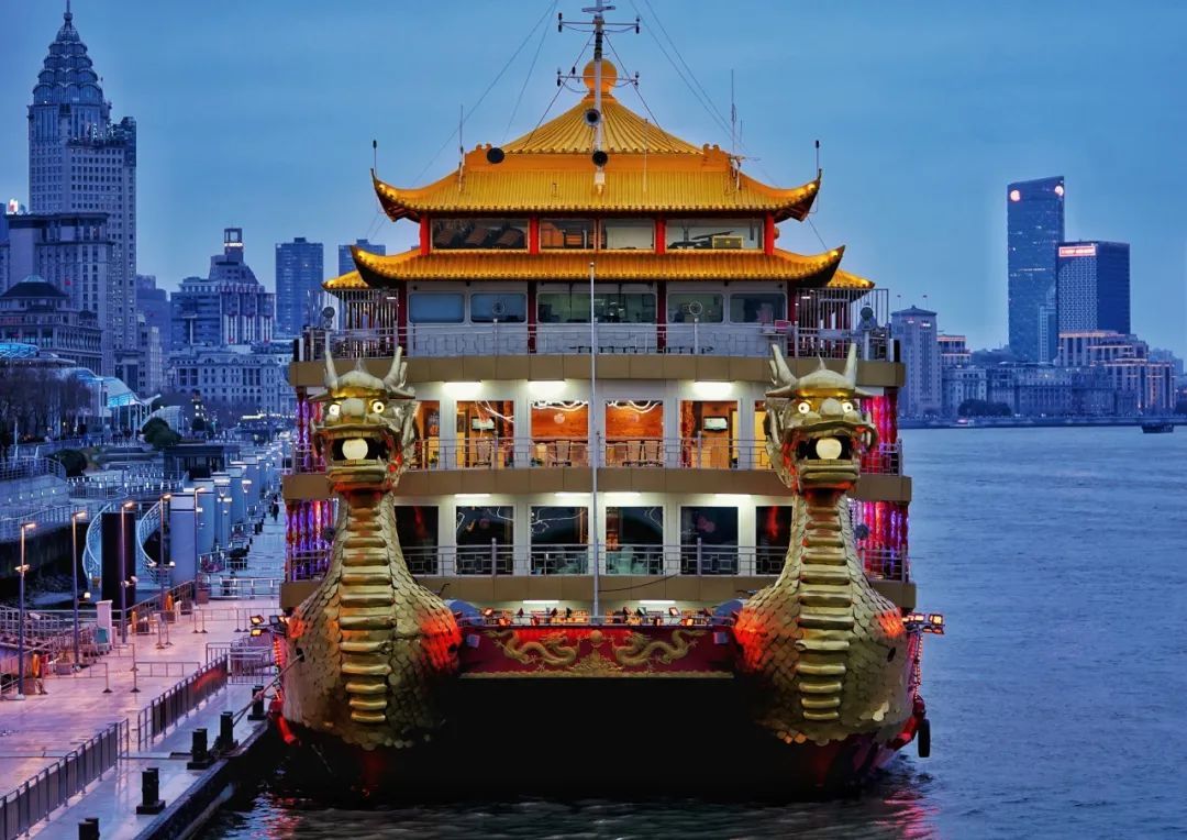 游船采用金色祥龙为设计基础,甲板上层建筑不仅有中国传统的亭台楼阁造型,还有烽火台、祈年殿等建筑,让游客在畅游浦江的同时品味游船上中国传统建筑和装饰的精华。