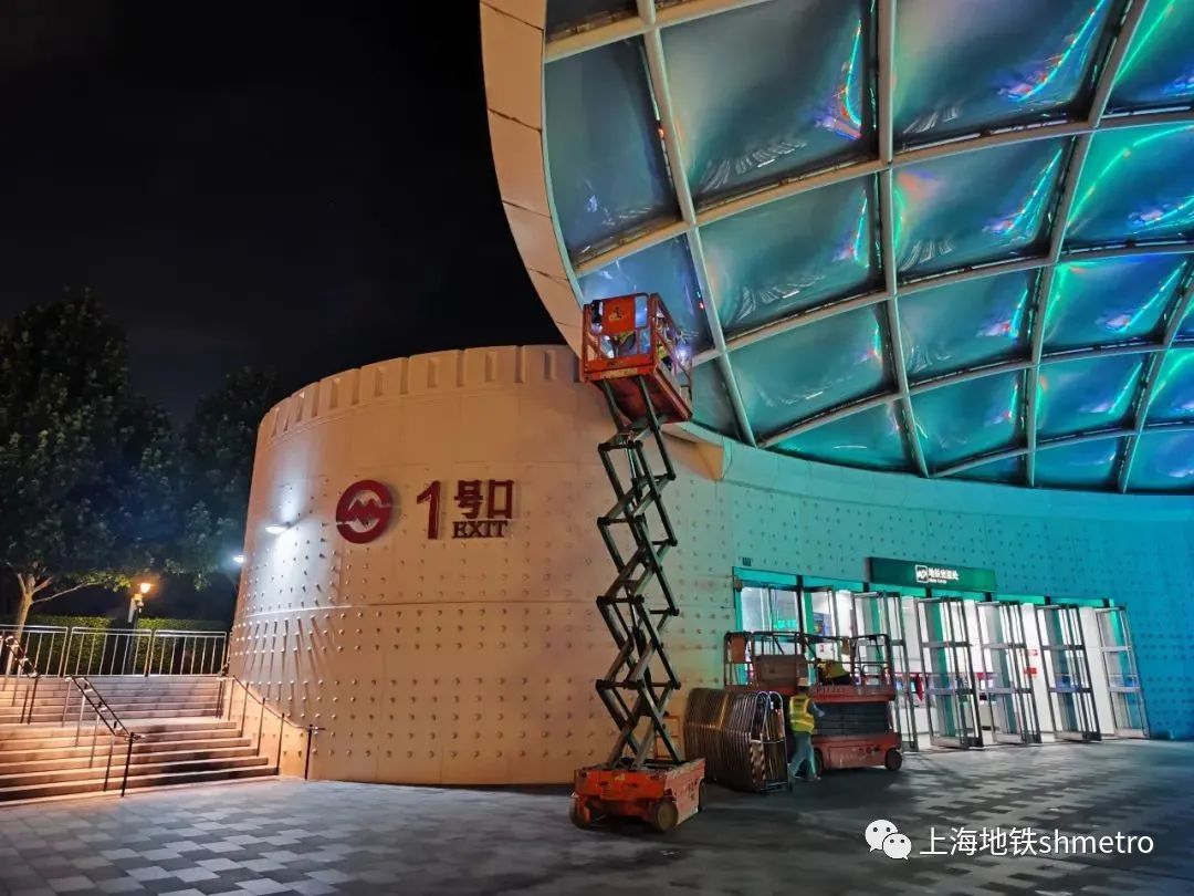 11号线迪士尼站是目前唯一能直通迪士尼乐园的轨道交通地铁站,车站出入口采用气膜结构,到夜晚主照明结合氛围照明在整体视觉上呈现强烈的梦幻效果。