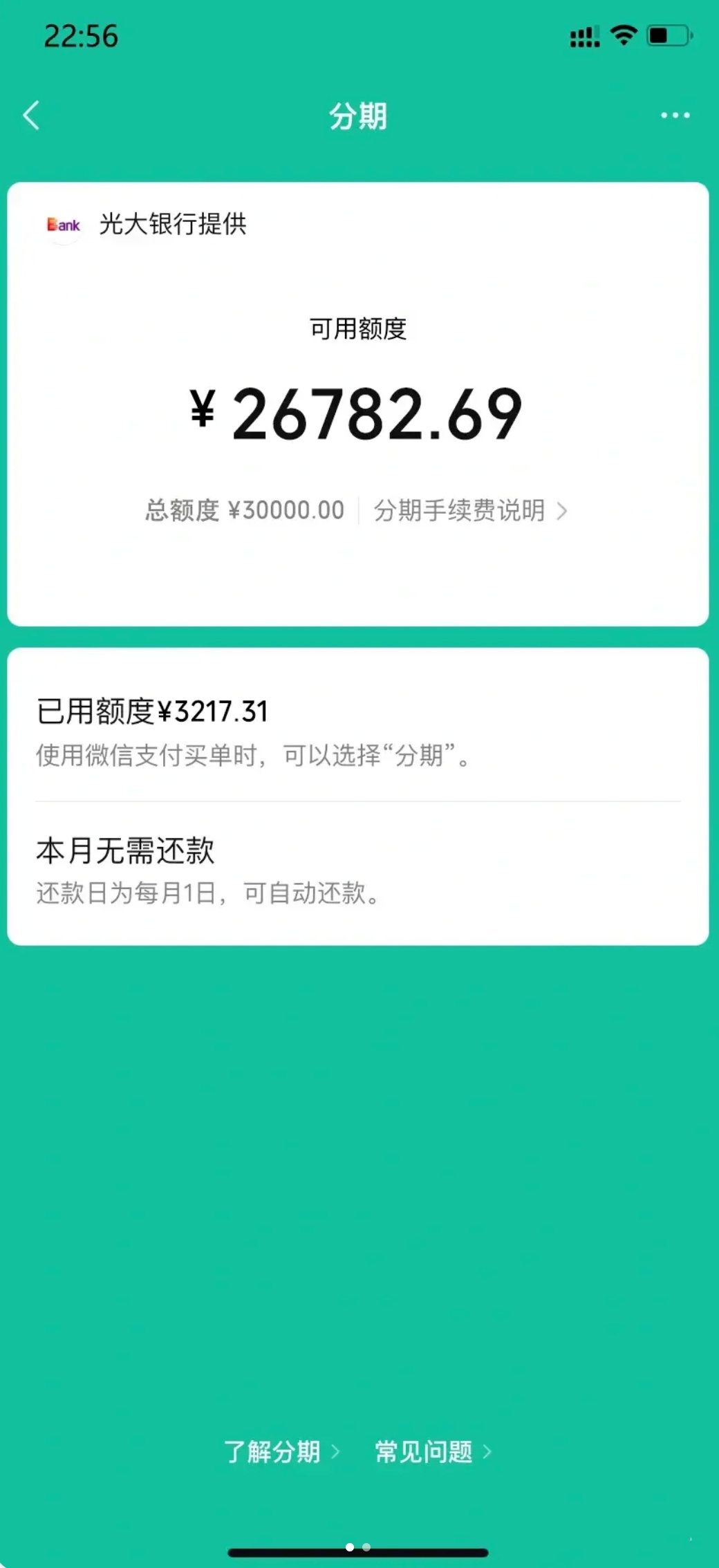 从网络截图来看,“分期”入口设置在微信钱包中,是一款助贷产品,目前光大银行、平安银行等机构已接入作为资金方。