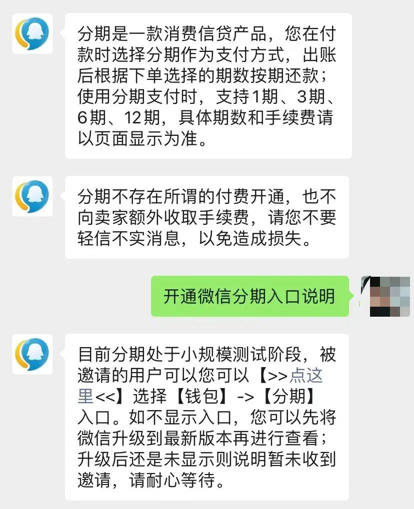 目前分期处于小规模测试阶段,被邀请的用户可以您可以选择【钱包】->【分期】入口。如不显示入口,您可以先将微信升级到最新版本再进行查看;升级后还是未显示则说明暂未收到邀请,请耐心等待。