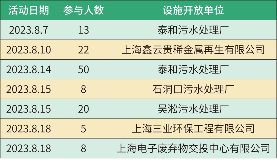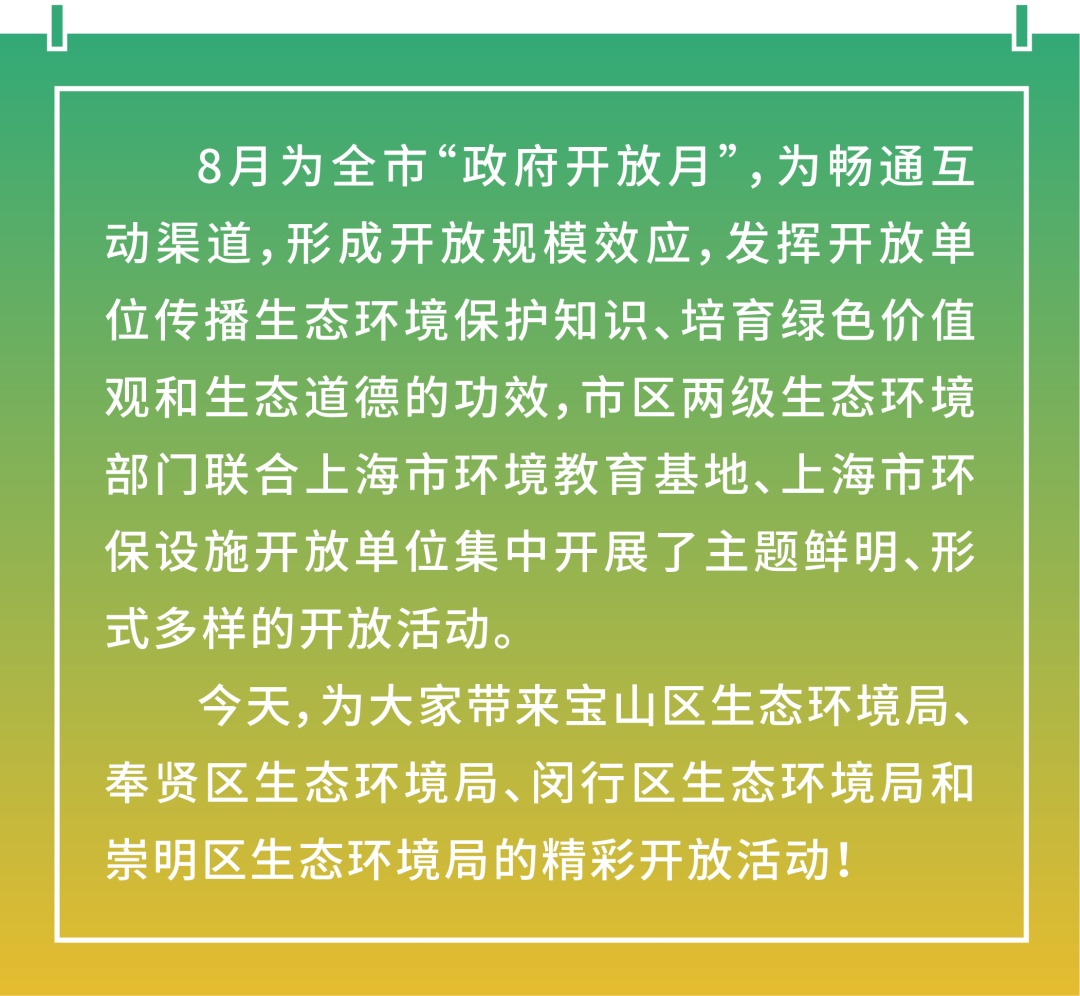 8月“政府开放月”,闵行区生态环境局结合本区工作实际,有序推进环境教育基地和环保设施开放单位的开放工作。闵行区6家单位共组织开放7场次,参加人数380人。