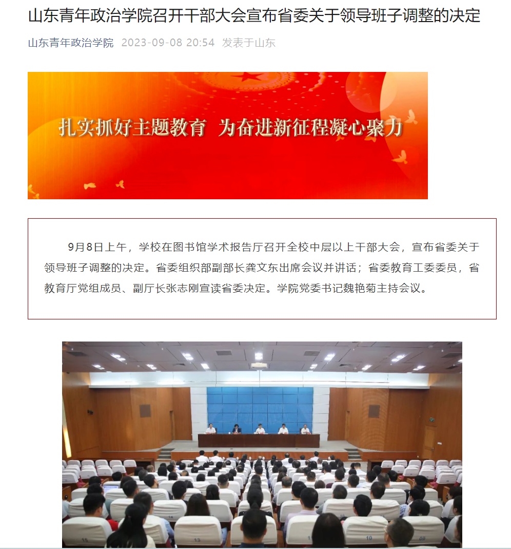 据山东青年政治学院微信公众号消息,9月8日上午,学校在图书馆学术报告厅召开全校中层以上干部大会,宣布省委关于领导班子调整的决定。省委决定,辛杰同志任山东青年政治学院党委副书记、院长。