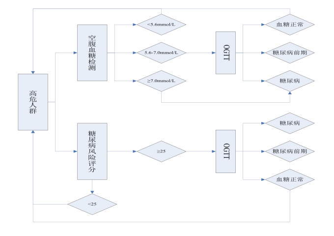 哪些为糖尿病高危人群? 在成年人(>18岁)中,具有下列任何一个及以上的糖尿病危险因素者,即为糖尿病高危人群: 点击看大图 糖尿病前期诊断标准是什么? 国际上主要采用的糖尿病分类诊断标准有两个:WHO1999年分类诊断标准和ADA2003年标准。我国当前采用WHO1999的定义和分期。糖代谢状态分类标准和糖尿病诊断标准如下: 点击看大图 社区糖尿病高危筛查流程是? 闵行区社区卫生服务中心采用空腹血糖检测或《糖尿病风险评分表》对糖尿病高危对象进行初筛。 社区筛查流程如下: 点击看大图 社区对糖尿病前期患者如何管理? 1.建卡 对尚未纳入社区管理的糖尿病前期患者,可至所在地社区卫生服务中心进行建卡管理。 2.随访管理 随访频度:每半年一次,每年至少完成2次。 随访内容:了解患者病情;提出运动和合理营养的建议;建议患者每年进行糖化血红蛋白检测,如伴有高血压、高血脂等其它病症,应同时监测血压和血脂情况,并进行随访记录。 3.诊断和转归 建议在管的糖尿病前期患者每年进行一次糖尿病诊断试验,根据诊断结果调整管理类别。 希望通过糖尿病高危筛查项目能帮助高危人群尽早识别糖尿病前期,使糖尿病前期患者通过进行适当及规律的干预使其逆转为血糖正常人群,至少应尽力维持在糖尿病前期,力争阻止或延缓其进展为糖尿病。