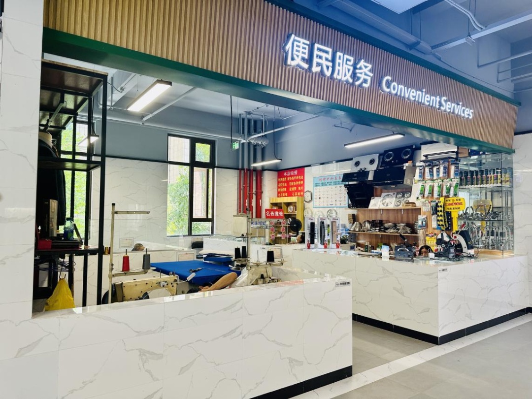 2楼,拾级而上,宽敞明亮的便民服务中心映入眼帘。在这里,你能一站式享受理发、裁缝、钟表维修、家电开锁、健康检测等便民服务。