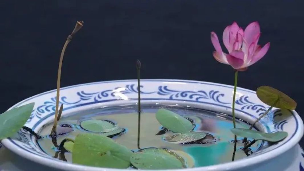 种在小容器里的莲花,荷花的缩小版本,方寸之间显荷韵。
