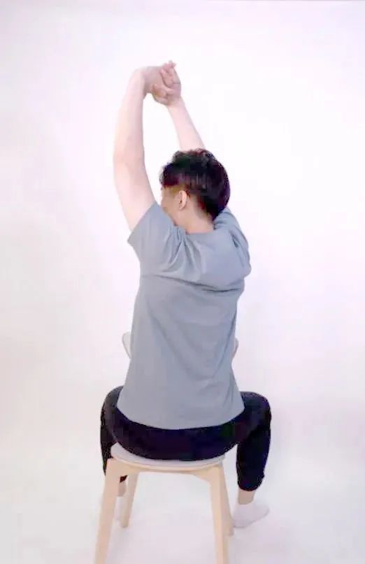 动作要领:身体正坐,双手十指交叉,吸气时掌心朝上,向上托举至头顶,随着托举动作,身体向上拉伸,到极限后停1秒钟;呼气时身体倒向一侧,到极限后停1秒钟,吸气时还原正坐位,左右交替拉抻5遍。