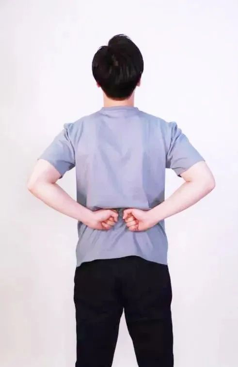 动作要领:身体站立,双手握拳,用食指掌指关节,点住手能够到的腰椎最上段,吸气时向腹部方向垂直按压,感觉酸胀后,保持掌指关节不离开体表,按压的同时腰部挺起,从上到下,边按推边挺腰边往下走,一直按到骶骨为止。从上到下按推3遍。