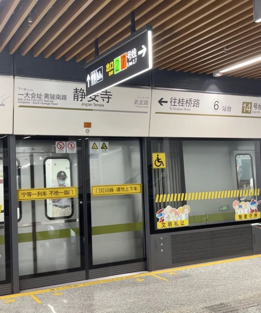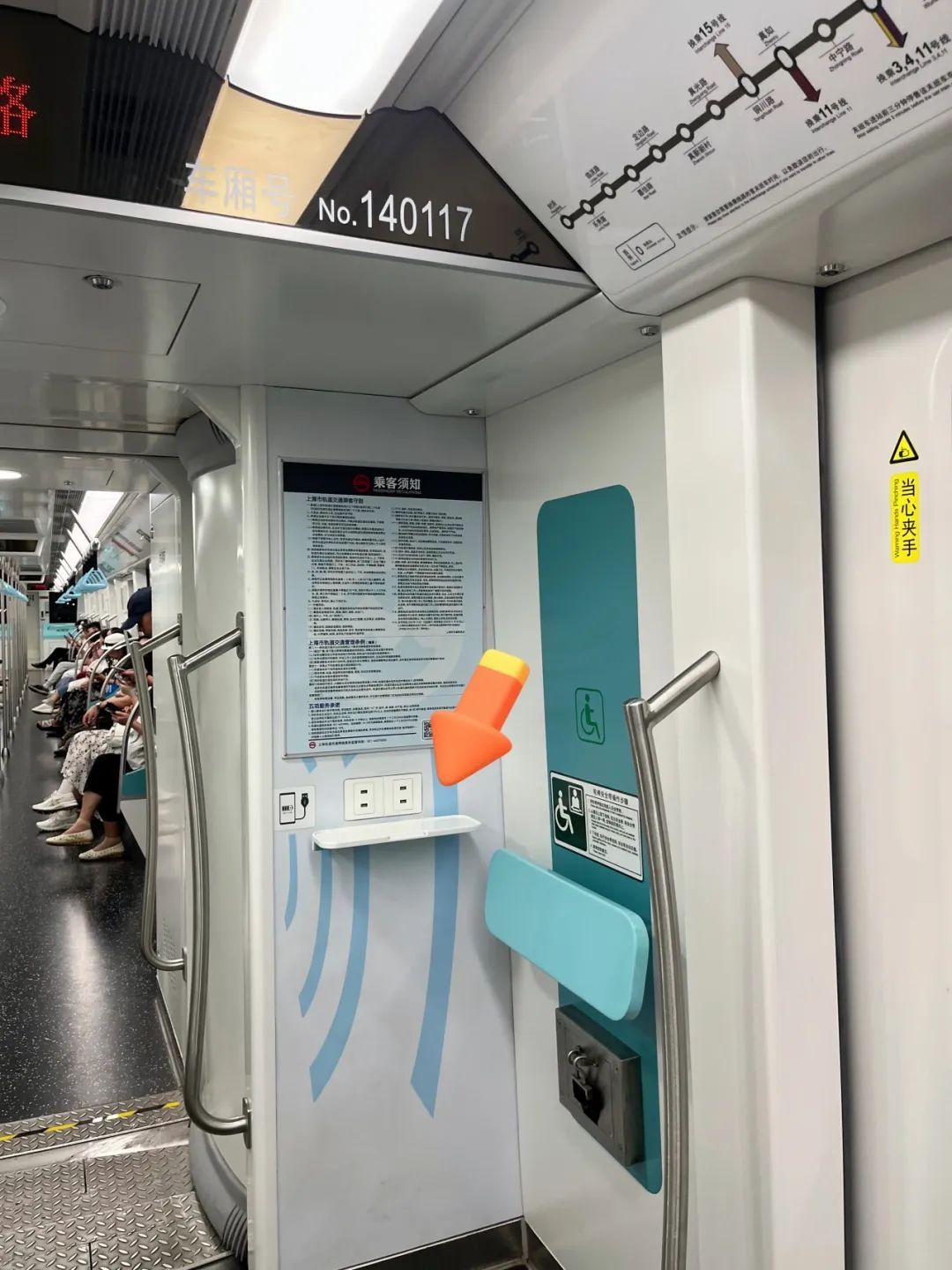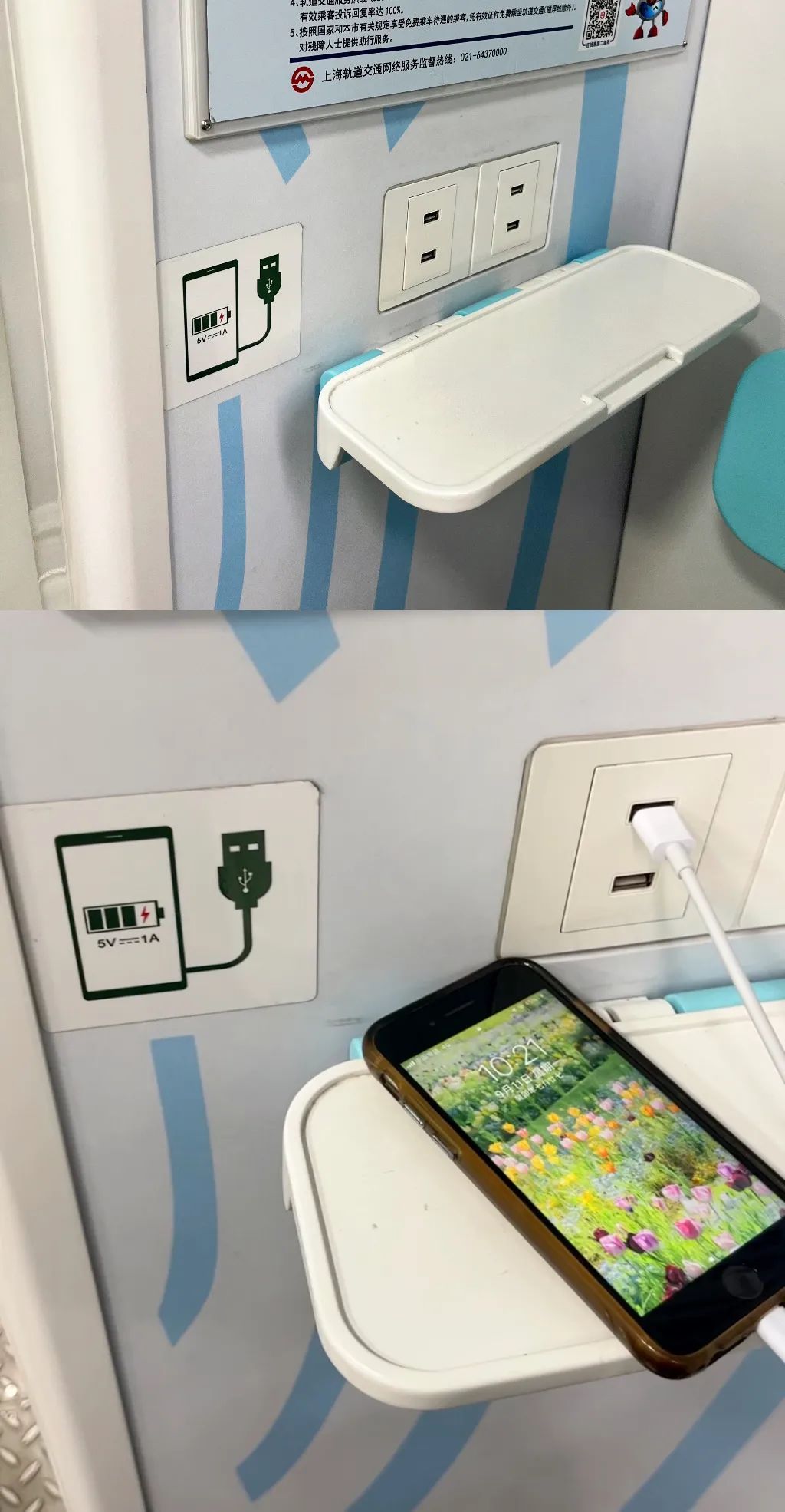你体验过边乘坐地铁边充电吗?如果在静安寺搭乘地铁14号线,你会发现车厢的头尾连接处都有4个USB充电接口,将折叠板放下后,即可使用自带的充电线充电。赶路过程中顺便还能充个电,十分省时。