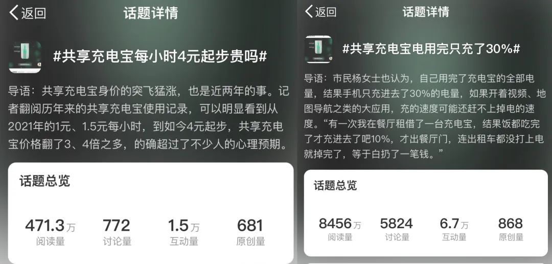 共享充电宝的出现和普及一定程度上缓解了人们的“低电量危机”,但也因其“价格越抬越高、充电慢”而广受争议。最近几个月来,“共享充电宝每小时4元起步贵吗”“共享充电宝电用完只充了30%”等话题频频登上热搜,引发了许多网友的共鸣和吐槽。