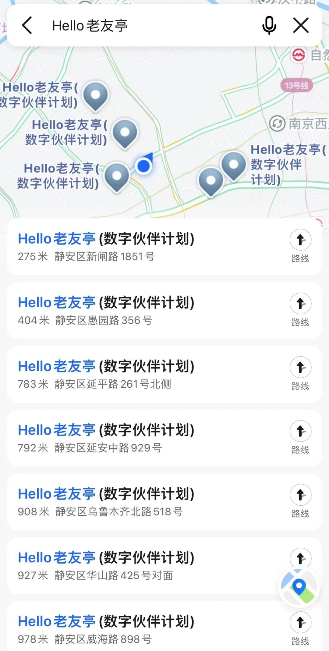 只需在手机的地图APP里搜索“HELLO老友亭”。地图显示,静宝所在位置一公里内便有7个点位。