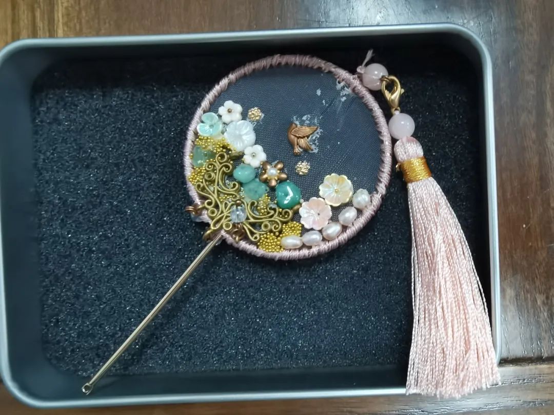 团扇取其明月之形,自带底蕴之美,扇面点缀上亮晶晶的花片与珠子等装饰,再与精巧的胸针相结合,不仅能体会到手工的快乐,而且作为装饰也格外吸睛。