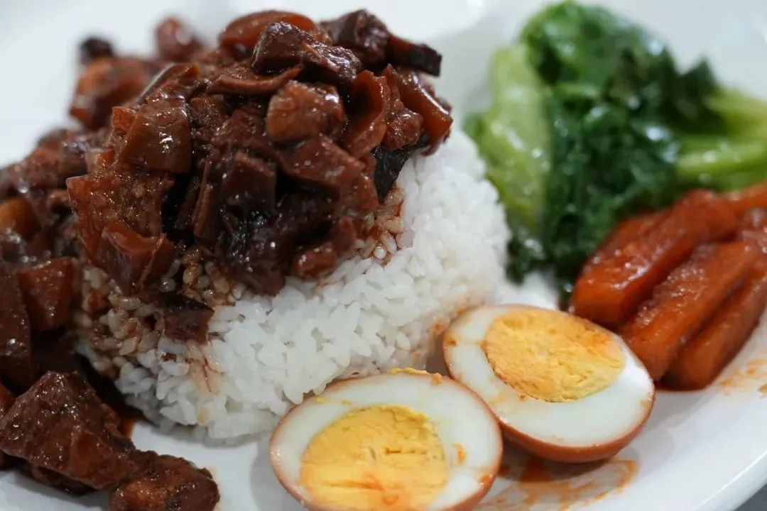 4.大火烧开后转小火,加入白煮蛋,炖煮两个半小时就完成啦(中间搅拌几次防止粘锅)。 5.青菜汆烫熟,将卤肉淋在米饭上,放上烫好的青菜、卤蛋和自己喜欢的配菜,就可以享用了!