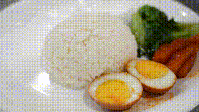 4.大火烧开后转小火,加入白煮蛋,炖煮两个半小时就完成啦(中间搅拌几次防止粘锅)。 5.青菜汆烫熟,将卤肉淋在米饭上,放上烫好的青菜、卤蛋和自己喜欢的配菜,就可以享用了!