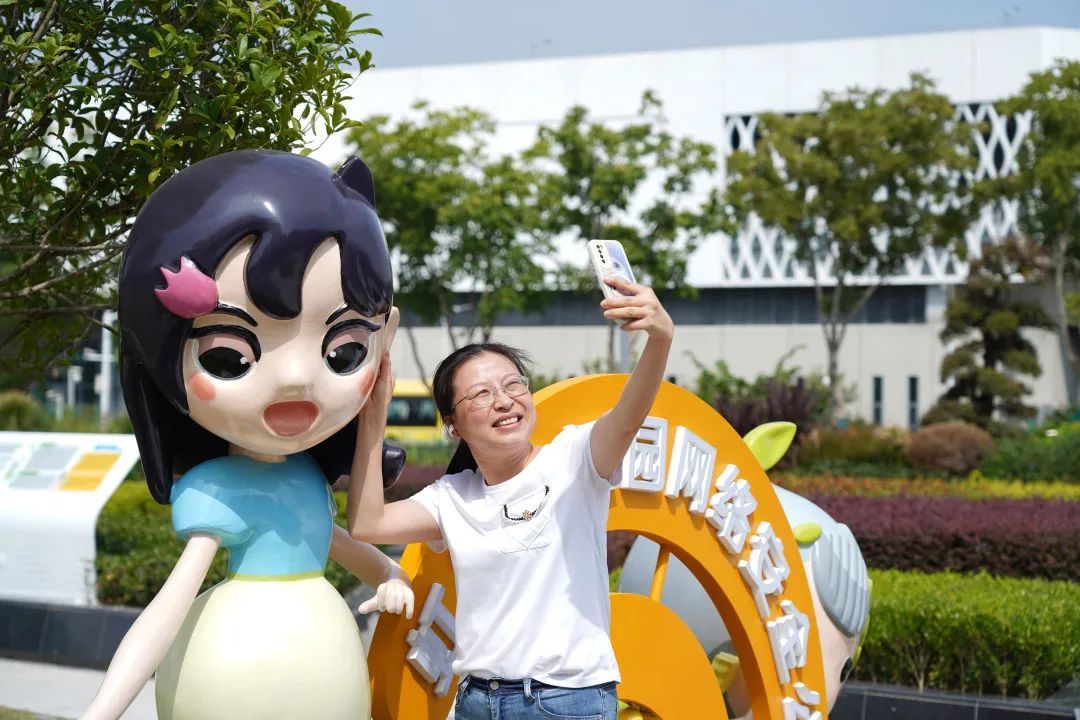 网络安全文创互动区,富有创意的键盘造型字母组合拼写出了“网络安全”的英文,而面前的装置像是一块虚拟的电脑屏幕,在温习知识的同时也可以拍照打卡留念,憨态可掬的青小萱、沪宝IP前,社区居民正在拍照打卡。