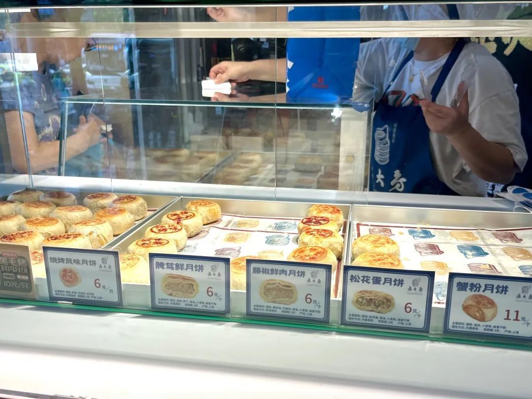 今年售卖的月饼既有鲜肉月饼、萝卜丝火腿月饼、鲜肉榨菜月饼这种传统经典味,又有黑毛猪鲜肉月饼、腌笃鲜月饼、藤椒鲜肉月饼、松花蛋月饼、蟹粉月饼等升级、创新之选,价格在6元/只至11元/只不等。