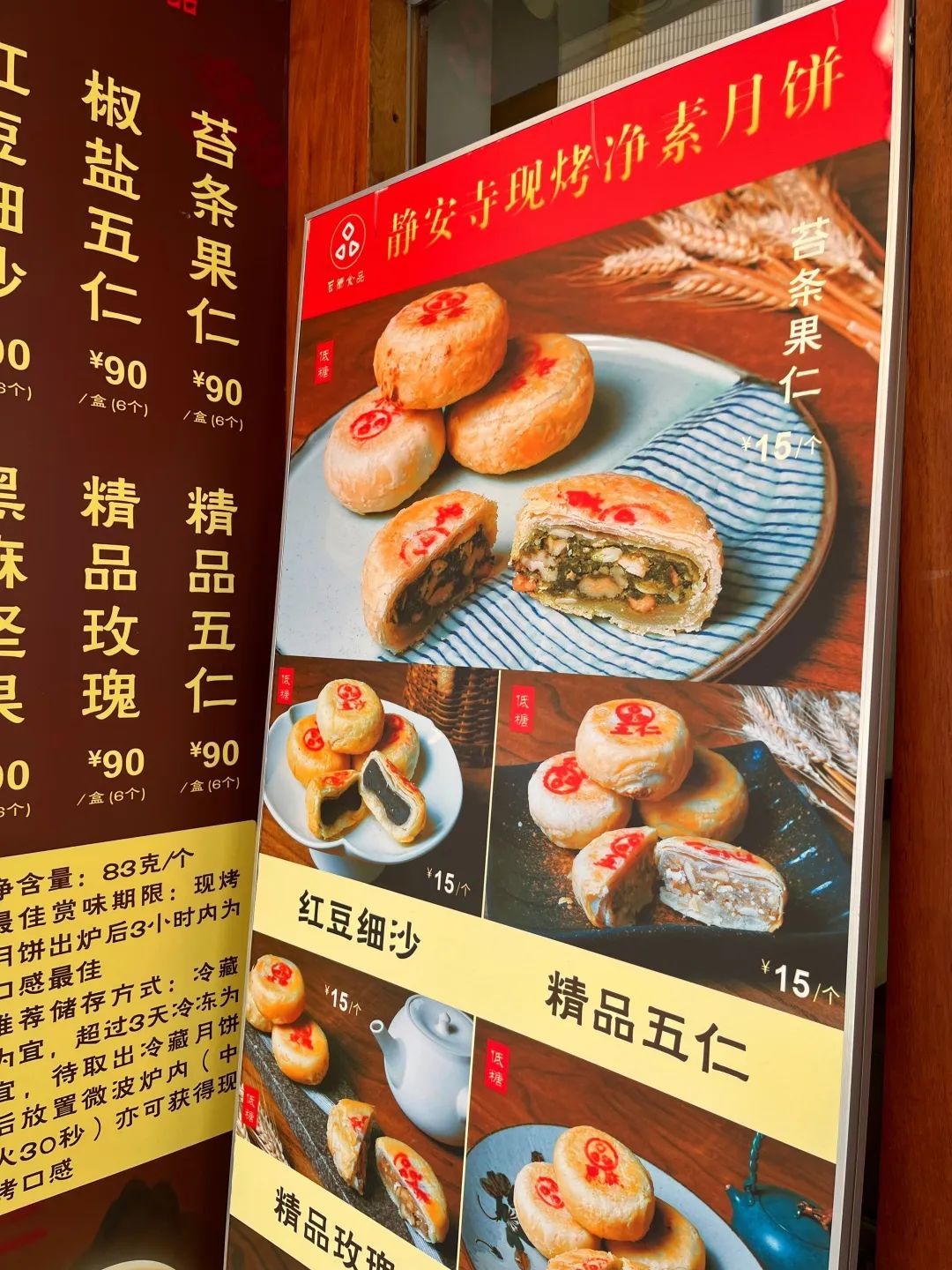 今年静安寺的净素月饼有苔条果仁、椒盐五仁、红豆细沙、精品五仁、精品玫瑰、黑麻坚果6种口味,售价均为15元/个,在静安寺外东侧的步行街上即可买到。据工作人员介绍,开售以来最受欢迎的口味是苔条果仁。月饼均是当日现烤现卖,店内暂不提供官方邮寄。