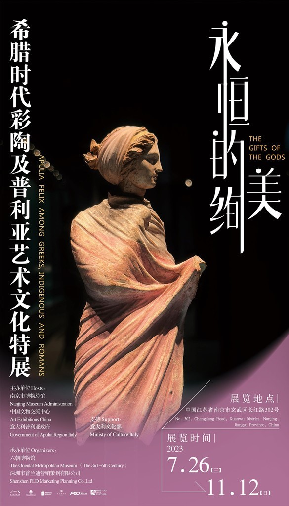 用“红得发紫”这句中国话,形容这件古希腊文物再恰当不过。在南京的六朝博物馆“永恒的绚美——希腊时代彩陶及普利亚艺术文化特展”中,最引人注目的就是这件断了一只手和长裙下摆的紫袍陶俑。