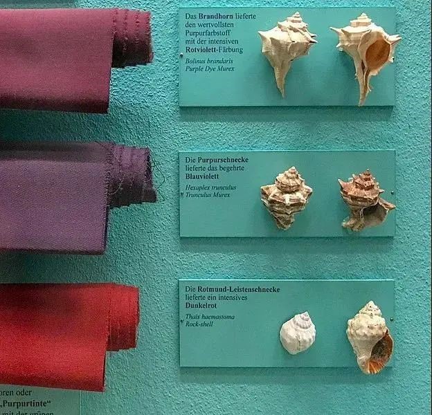 这种紫被称作推罗紫,也叫泰尔紫、提尔紫。推罗是今天黎巴嫩地中海沿岸的一座古城,紫色以城得名,生产基地却遍布地中海东岸。如今,1000多年前人们丢弃的贝壳堆积如山,已经成为地中海东岸的一种特色地貌。这种紫色需要从地中海岩螺和染料骨螺中提取,砸开它们的外壳,挤一下浅色的鳃下腺,就会有一滴晶莹的大蒜味黏液滴下来,在阳光和空气中由白色渐渐变成浅黄色、绿色、蓝色,最终成为紫色,混合两种贝类的液体就能制造出一种黑紫色,这是顶级的颜色。古罗马学者老普林尼写道:“这种推罗色作为凝固的血的颜色时最受欢迎,它经反射而变暗,经透射的光而变得鲜明。”