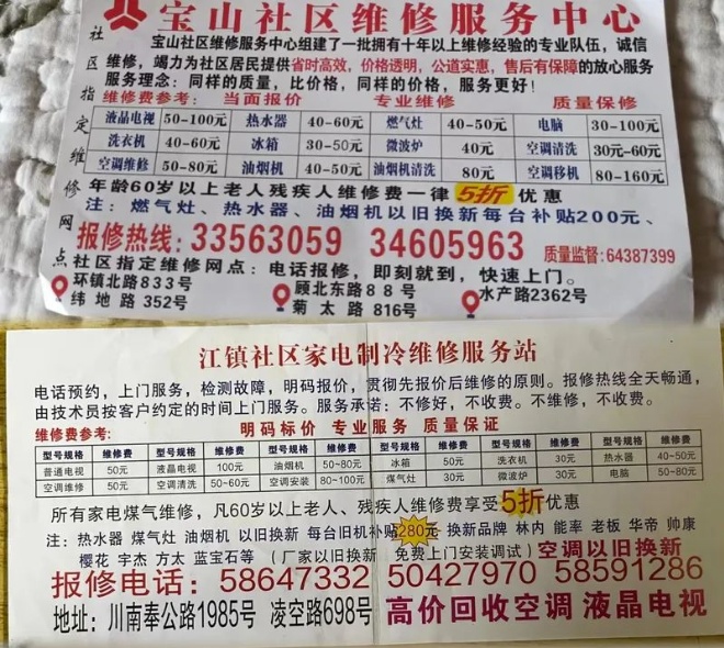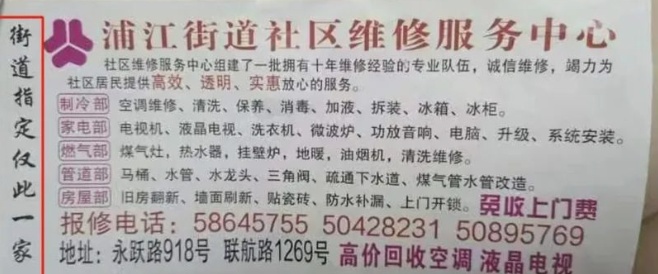 有的还注明:“社区维修服务站”“街道指定物业维修中心,只此一家”“专业服务,明码报价”。