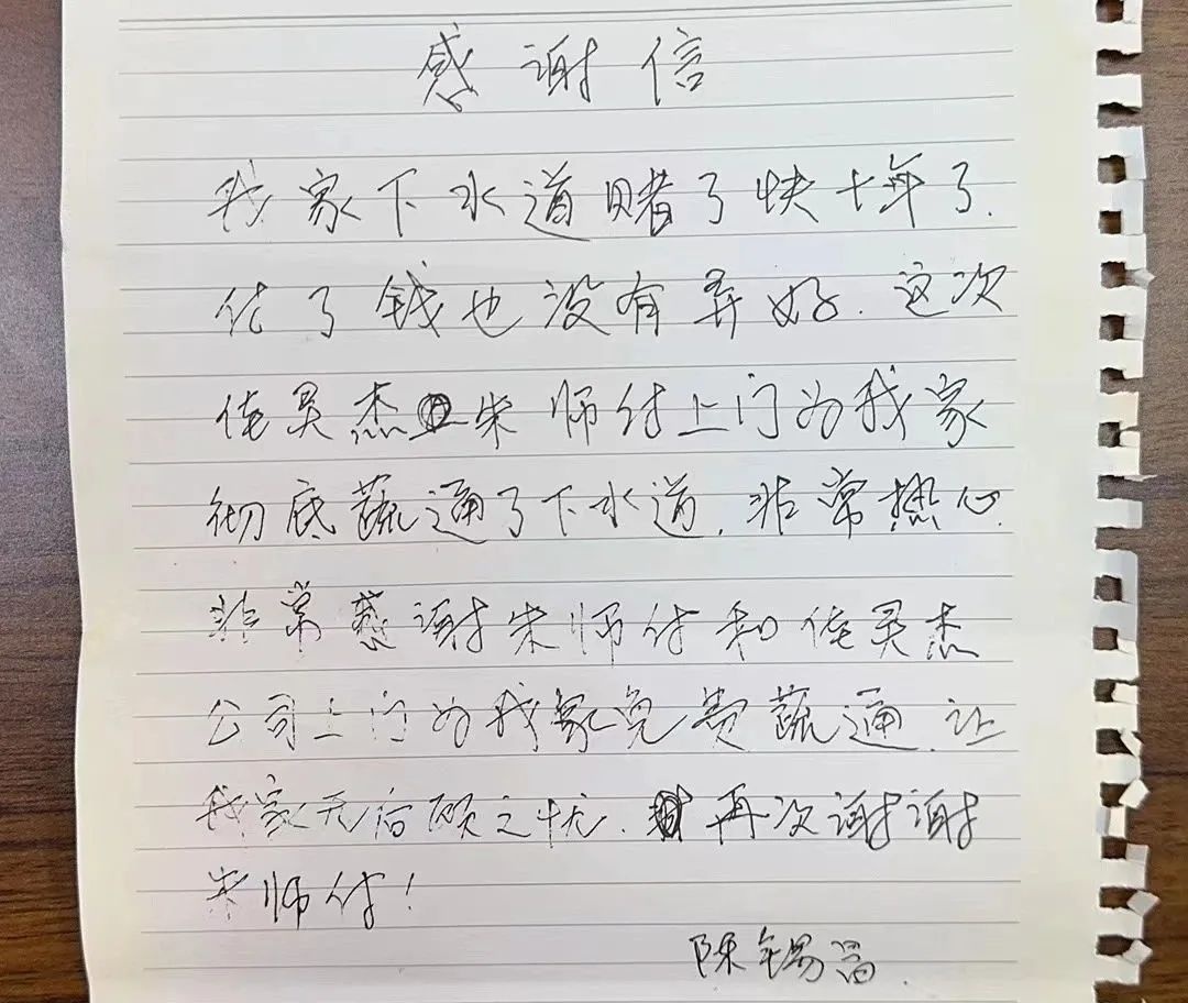 服务人员了解到这一情况后,立即向公司上报。公司随即安排专业维修人员前往老人家中进行下水道疏通。疏通时,维修人员又发现老人家中的下水道较长,无法通过常规方式彻底疏通,就特地找来加长版的弹簧工具,使用长达5米的弹簧成功疏通了下水道,困扰老人十年之久的下水道易堵问题终于得到彻底解决。