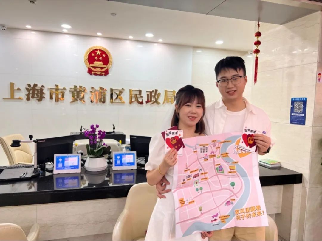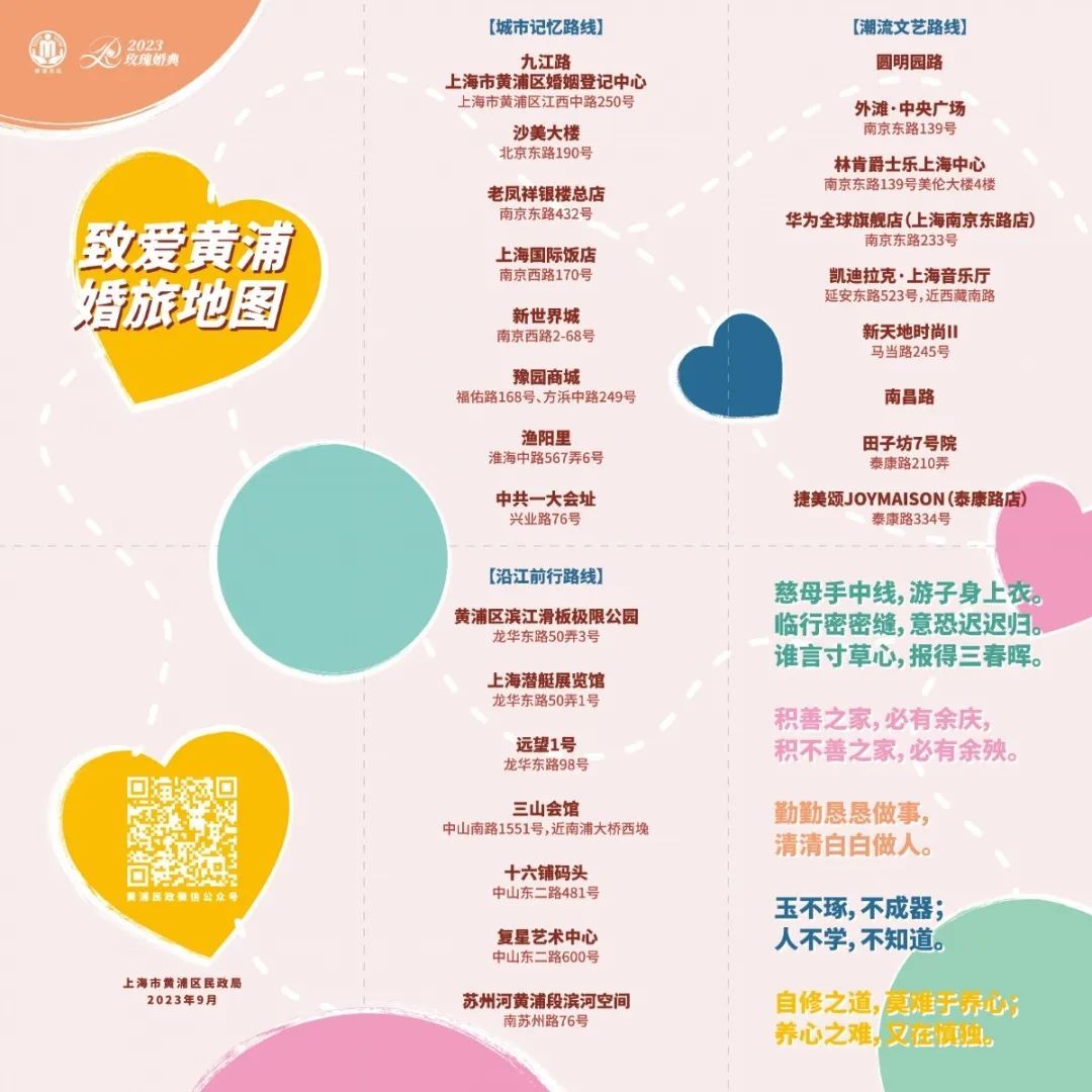 初秋街头,阳光静好而温柔 在城市之心、经典黄浦 全市首份致爱地标、甜蜜路线闪亮发布 打卡城市,遇见爱情 愿甜蜜City Walk 见证更多凡人幸福与城市美好 9月17日,2023年玫瑰婚典暨黄浦区结婚登记大型户外颁证仪式在外滩·中央广场浪漫举行。本次活动由上海市文旅局、上海市民政局、黄浦区政府指导,黄浦区文旅局、黄浦区民政局、上海市文化和旅游事业发展中心主办。作为上海旅游节的重要活动之一,玫瑰婚典自1998年创办以来,已历经25年的发展蝶变,不断通过集体婚礼倡导婚俗新风,逐步成为展示上海城市形象、搭建沟通桥梁的经典名片。 活动现场面向全市首发《致爱黄浦 婚旅地图》。婚旅地图以黄浦经典地标为切入点,设计了从黄浦区婚姻登记处出发至多个推荐拍摄点的3大经典打卡路线。 新人们在黄浦区婚姻登记处完成结婚登记后即可获得《致爱黄浦 婚旅地图》,根据示意图,任意选择城市记忆路线、潮流文艺路线、沿江前行路线,就能定格属于自己的甜蜜浪漫瞬间。婚旅地图上还特别印制了经典家风家训,突出“家风里藏着孩子的未来”,让新人在打卡甜蜜路线时,更不忘新时代家风家训。在旅拍中,还贴心为新人们配套提供了明信片,以不同场景外框为底版记录每一处美好的记忆。 作为上海红色文化的根植地、海派文化的辐射地、江南文化的传扬地,黄浦区民政局立足区域文化资源禀赋,积极打造集婚登、婚拍、婚旅于一体的致爱聚集地,为全市提供了爱情地图的“黄浦样本”。