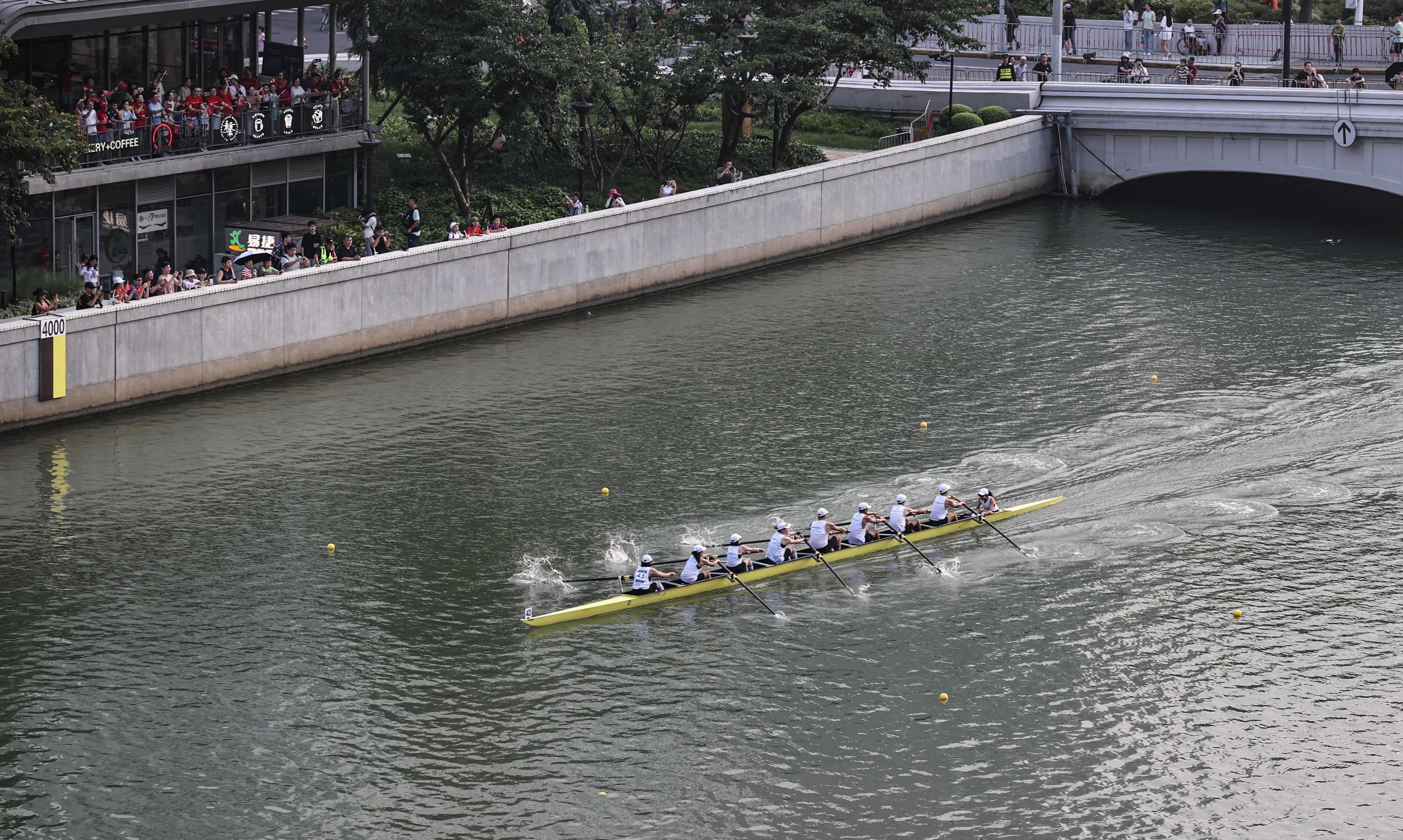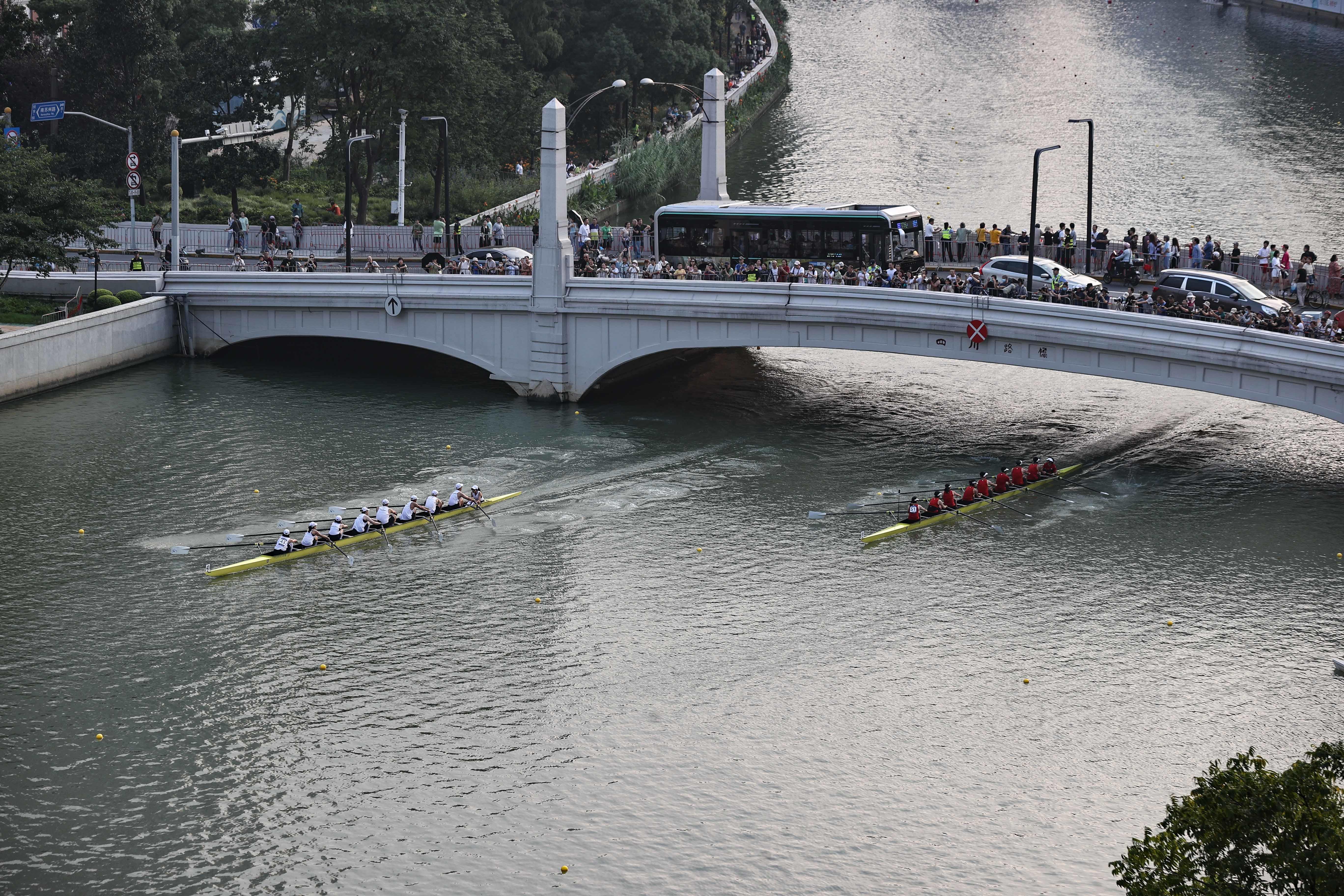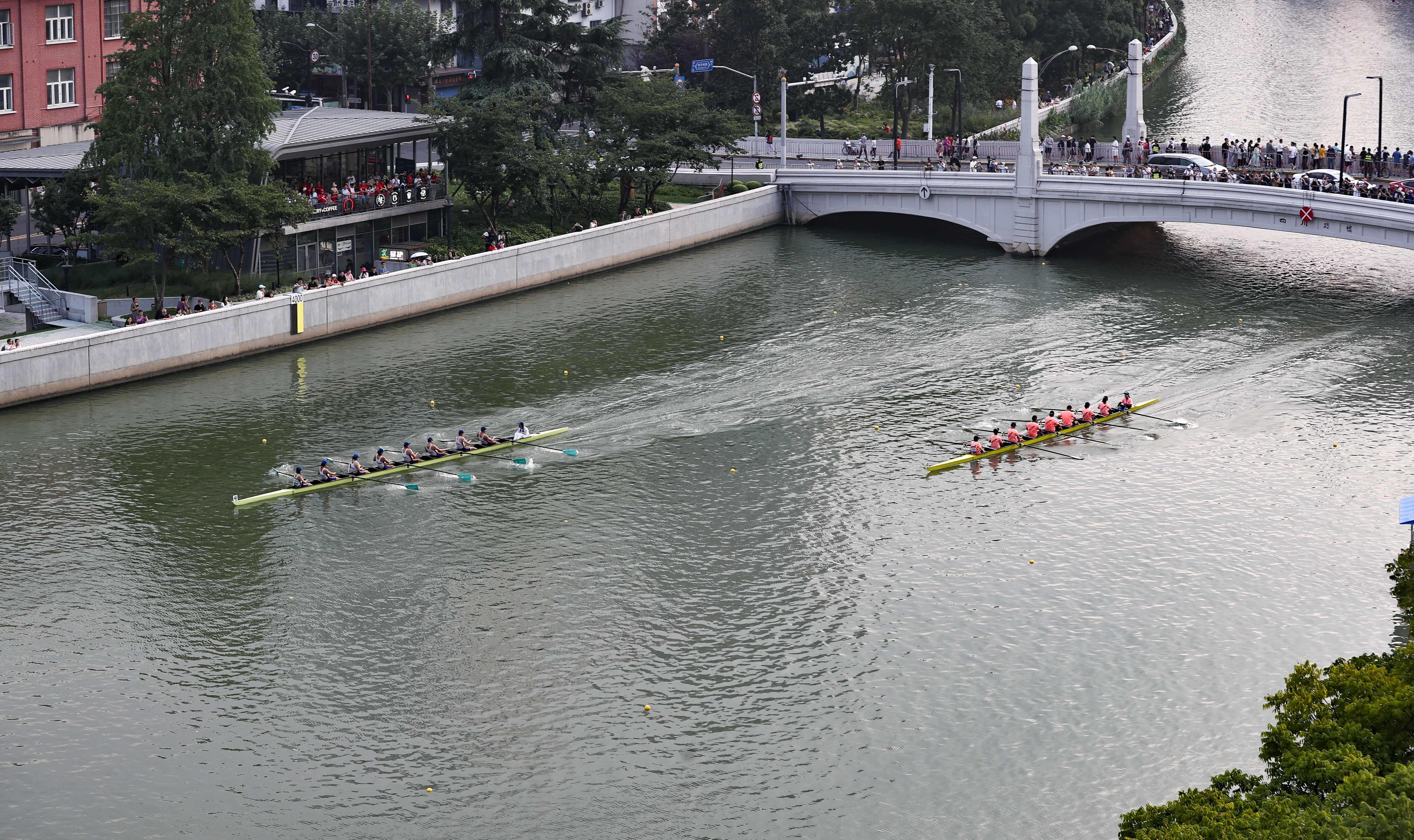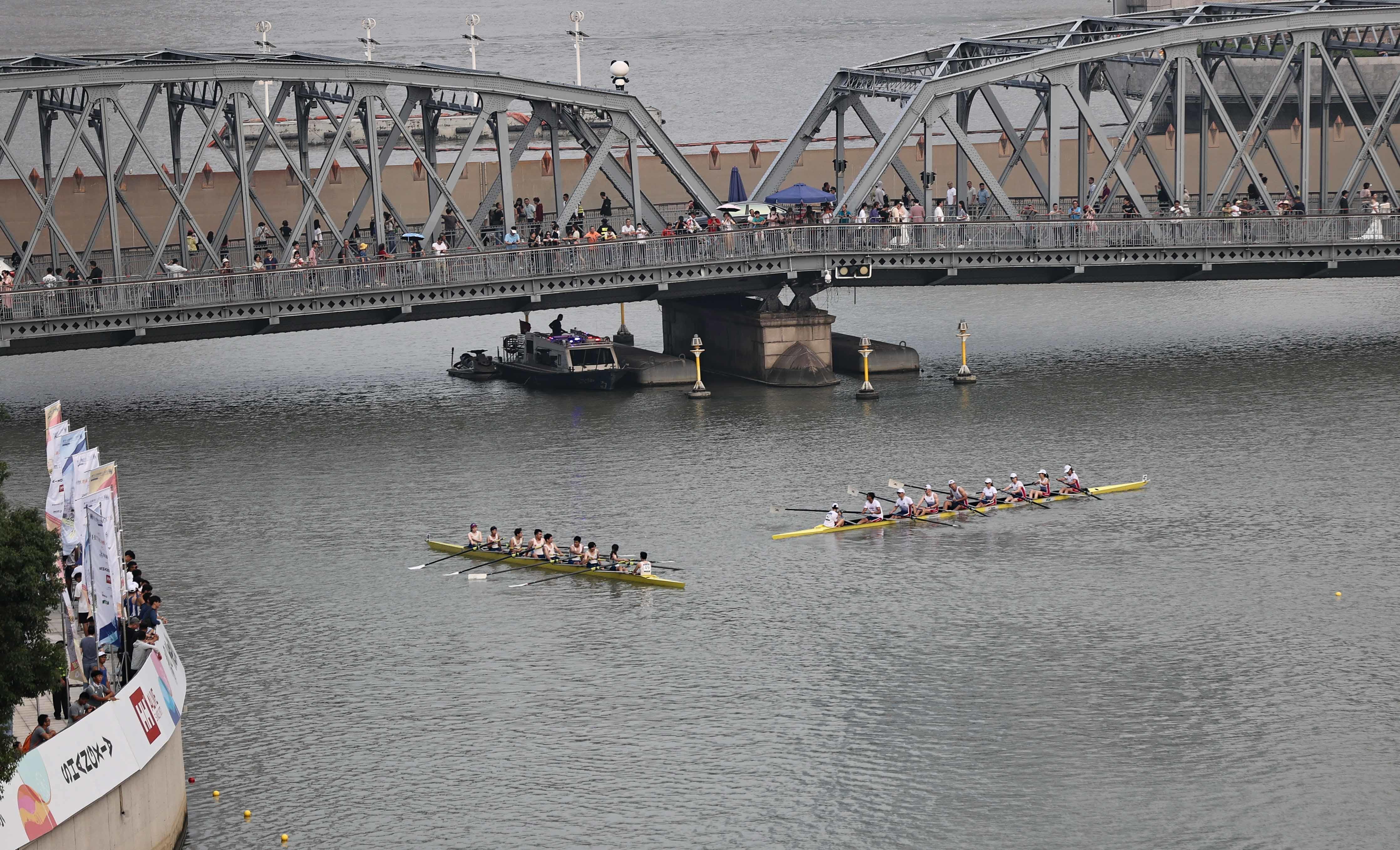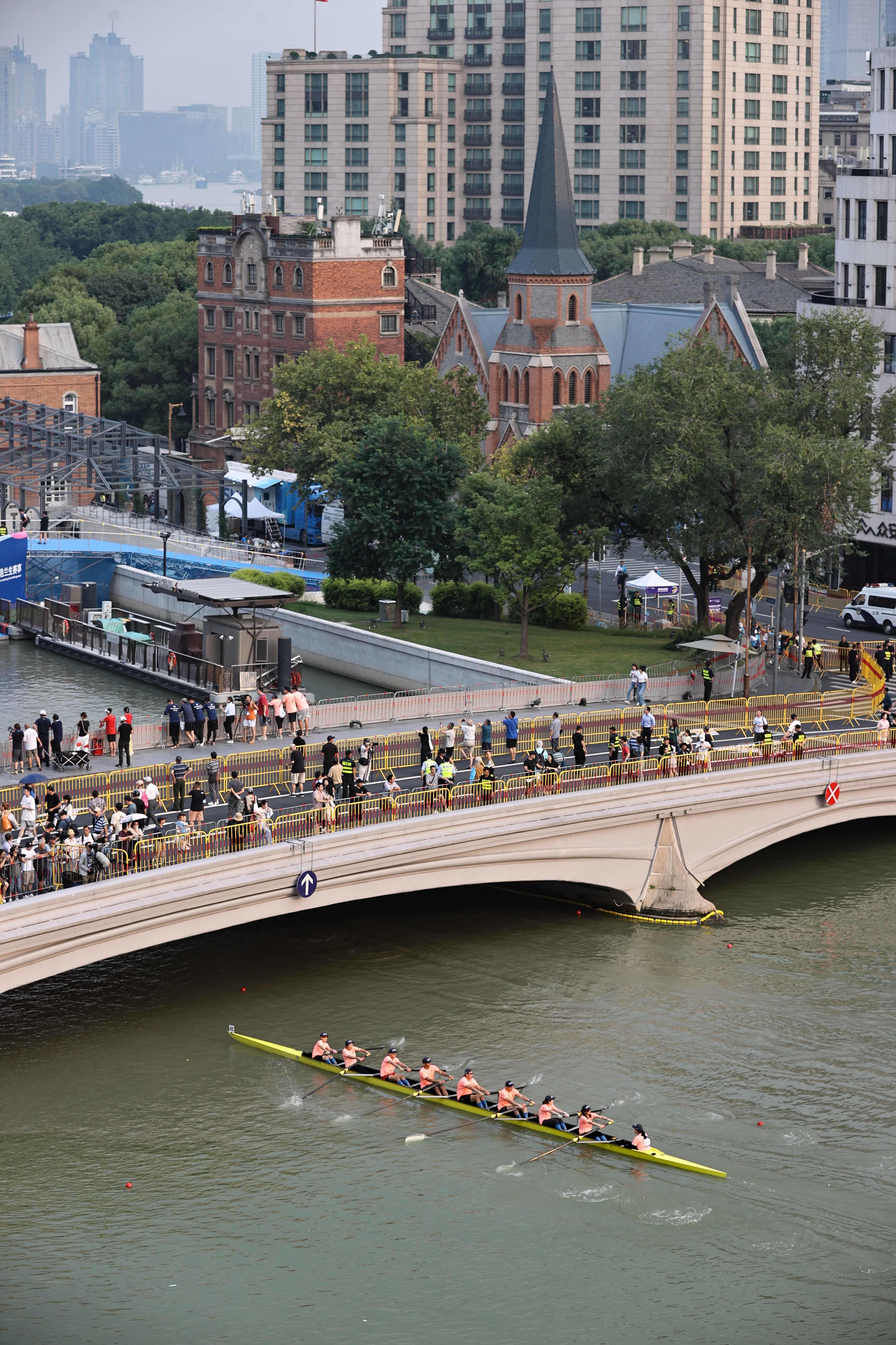 在苏州河上举办的赛艇公开赛与“上马”一样,属景观体育赛事,4.2公里的赛道沿途集聚了四行仓库、上海邮政博物馆、外白渡桥等城市标志景观,樱花谷、最美花园、飞鸟亭……,苏州河黄浦段美景一一呈现,融入其中。在演绎“速度与激情”的同时,也充分展现了赛艇与自然、与城市的完美结合,体现了“一江一河”治理的成果,以及市民美好的幸福生活。