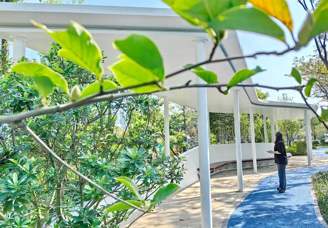在植物配置上,主要选用玉兰、红梅、樱花、娜塔栎、无患子、榉树等开花、色叶树种,在丰富季相变化的同时,契合“寻春赏秋”的植物设计主题;特色廊架、园路系统、休闲座椅等功能设施引入,使植物景观与休闲空间完美结合,打造出可赏景、可休闲、可停歇的绿色公共空间。