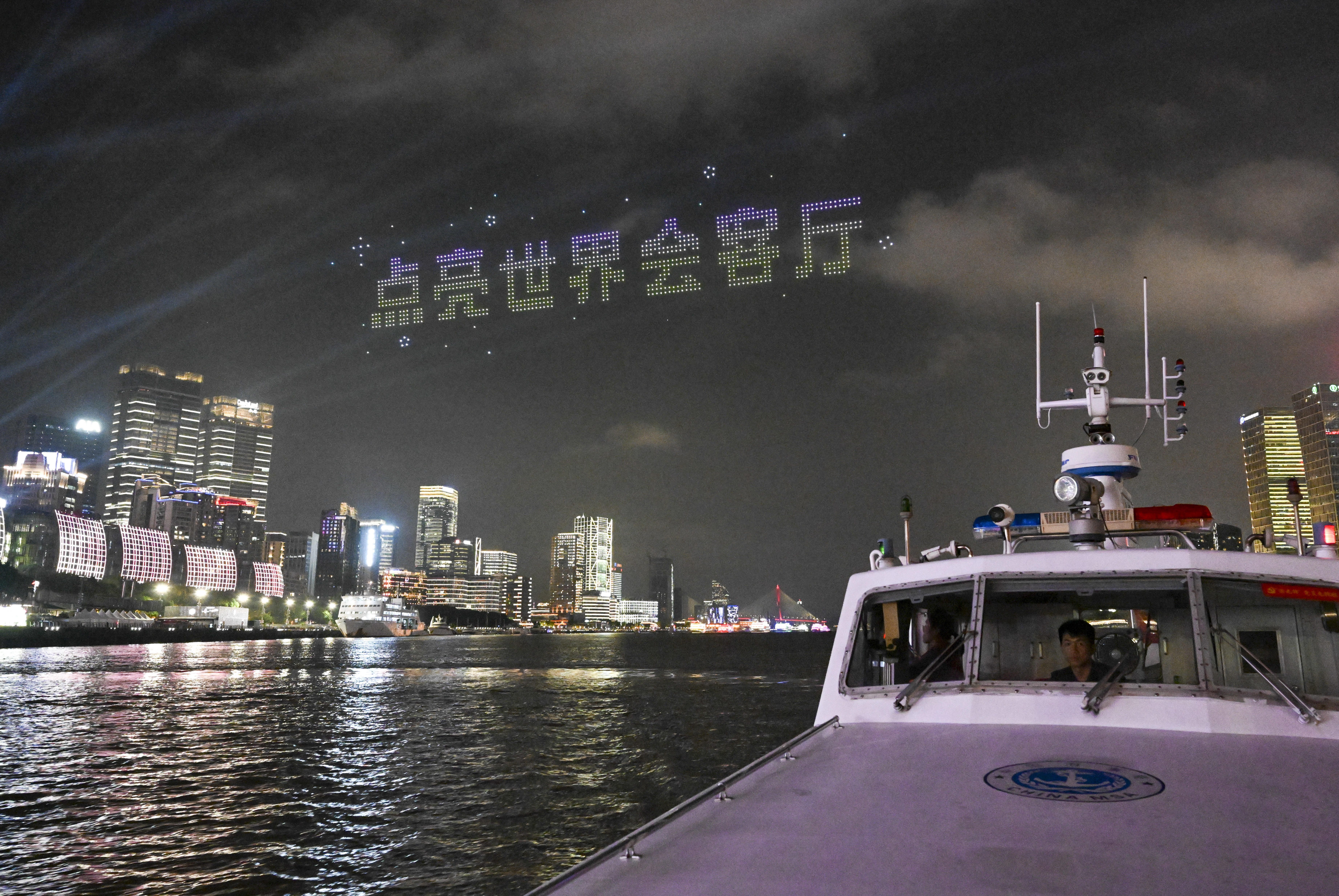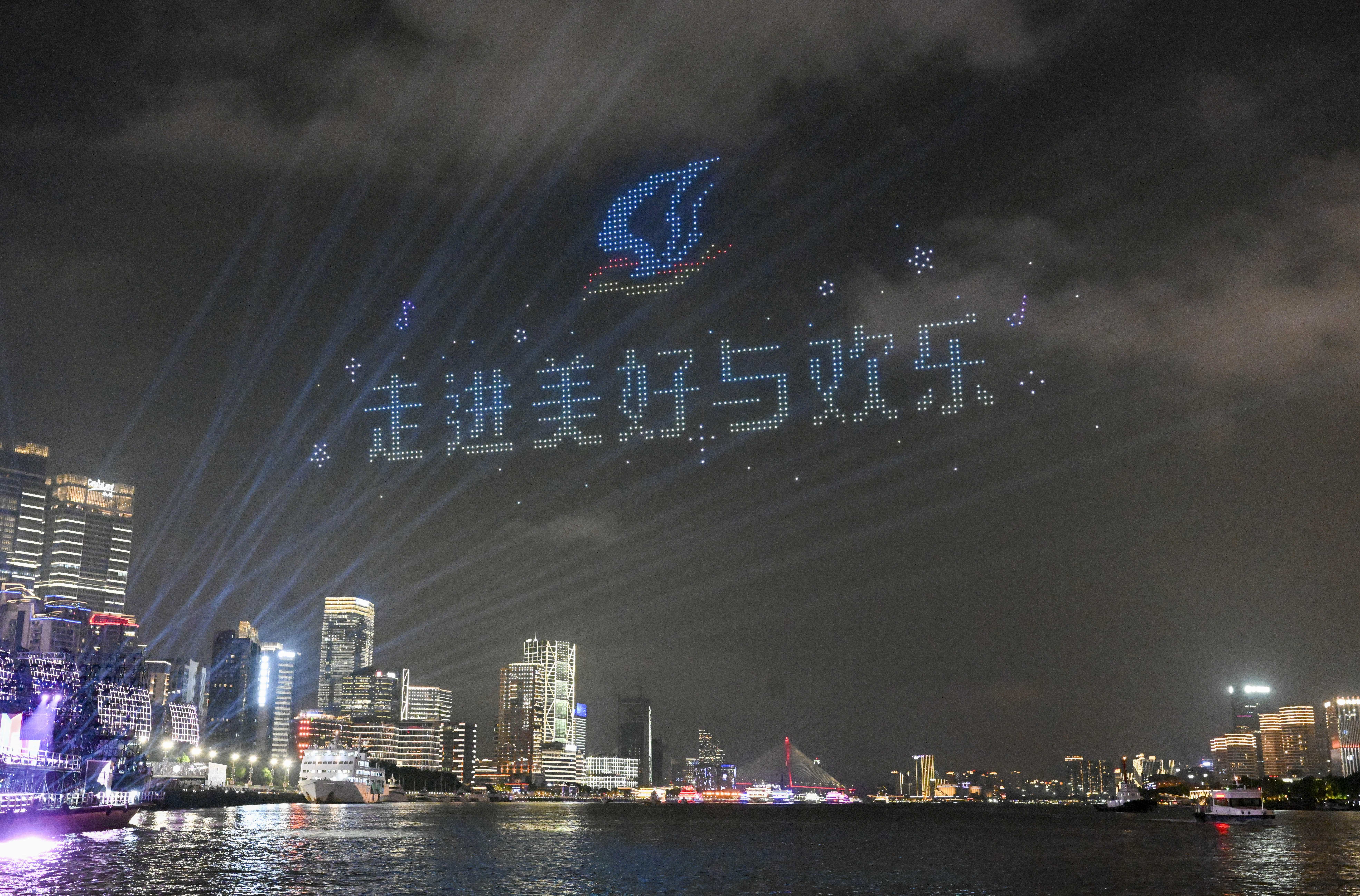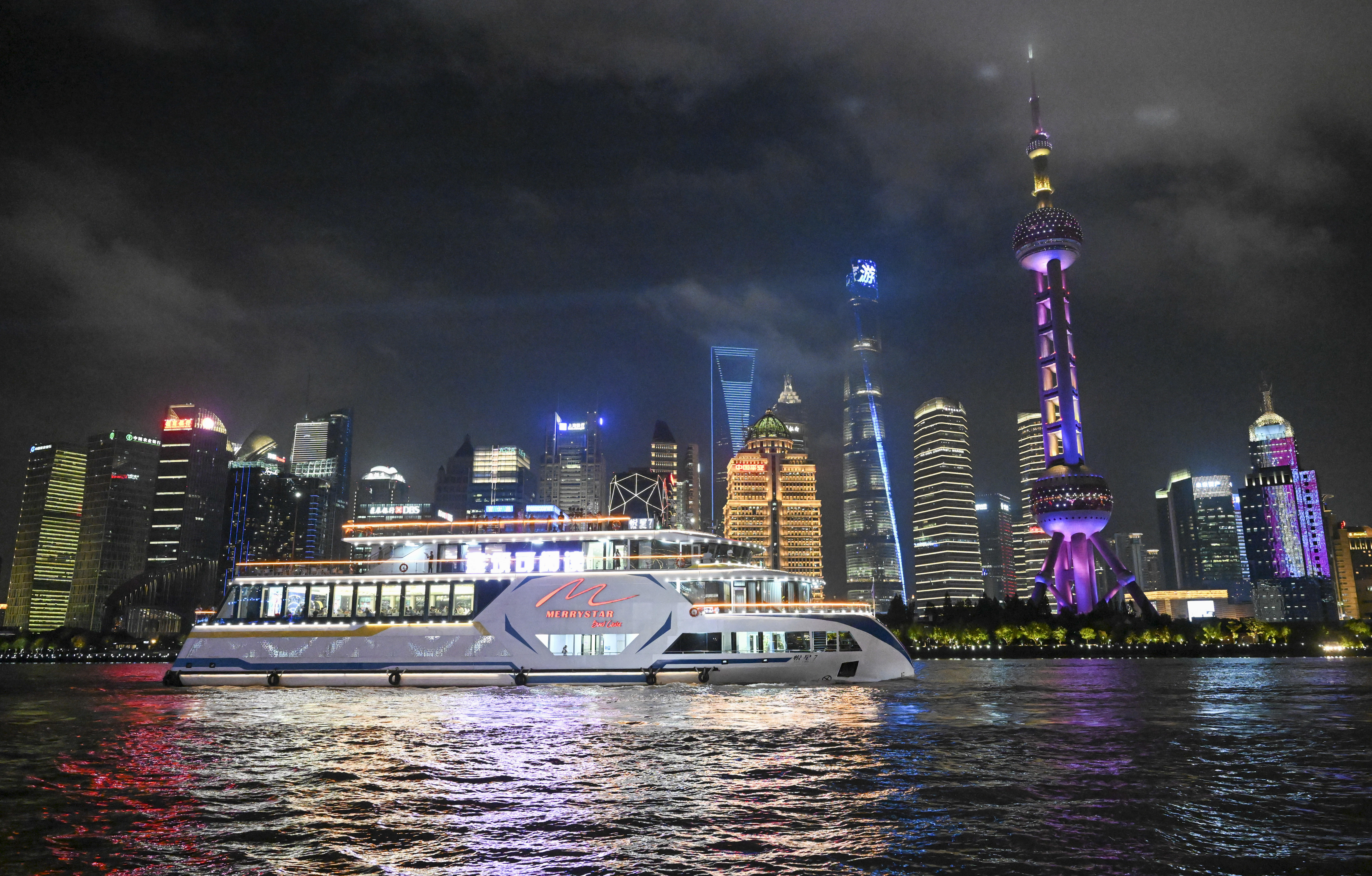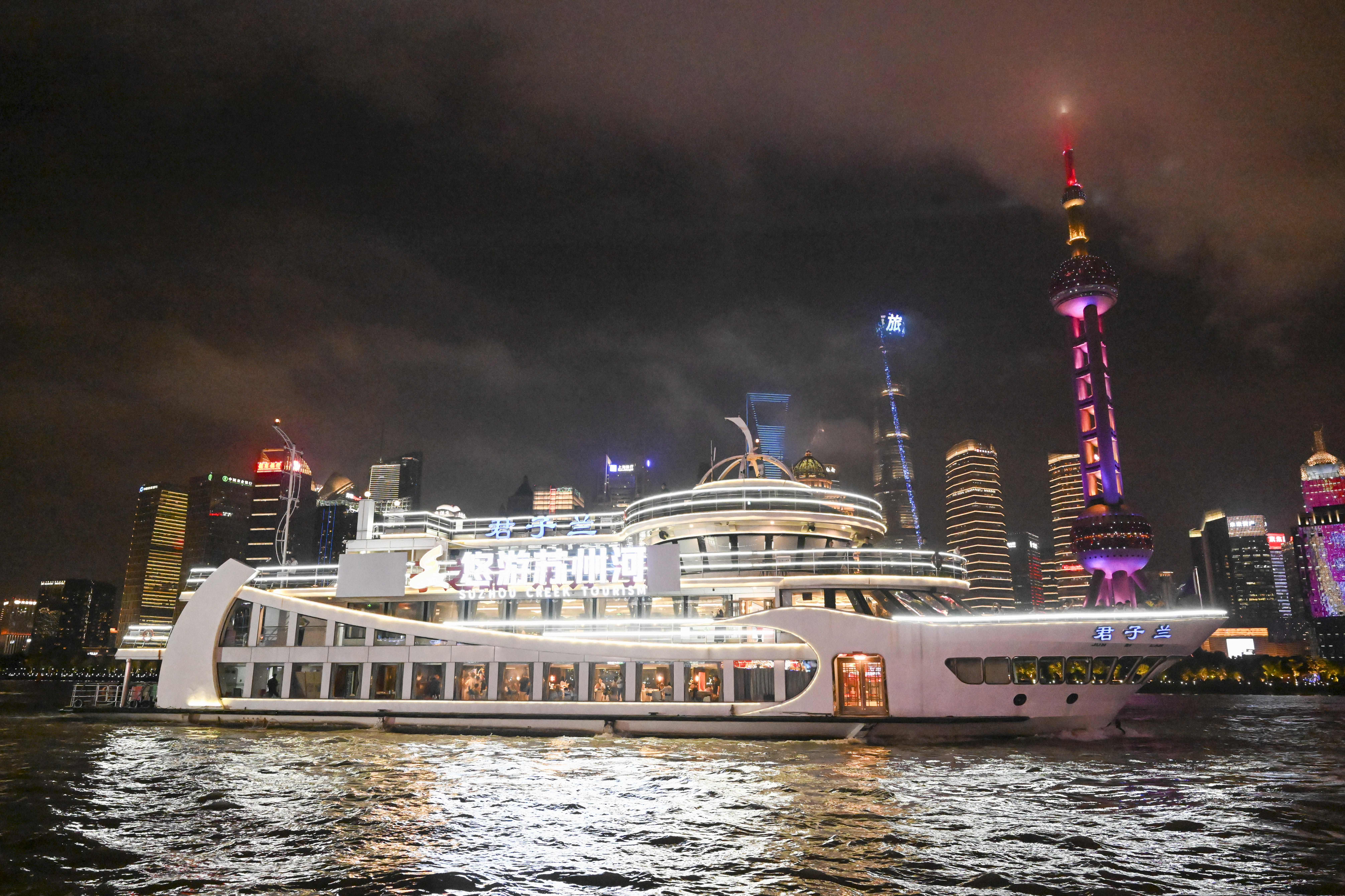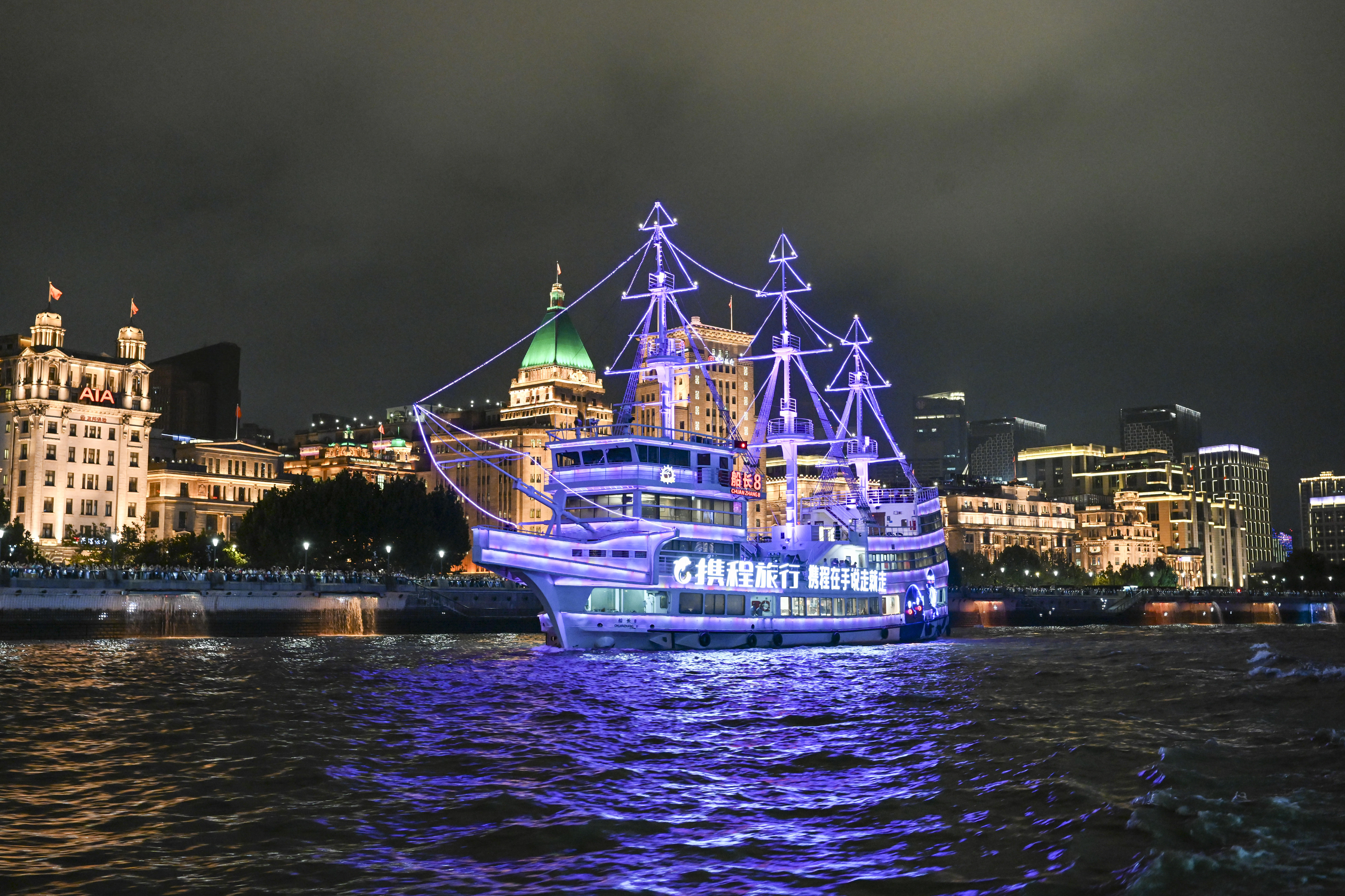 参加巡游的游览船进行了灯光亮化和装饰升级。19艘游览船被分为前后2个编队,在4艘巡逻艇的护航下,呈双排交错队形依次经过北外滩国客中心开幕式前沿水域。国客中心主会场对巡游彩船作主题演绎并配合进行节目演出,以精彩的水上巡游联动岸上光影特效和文旅活动,全方位点亮大巡游之夜,直播展示黄浦江两岸物阜民丰、流光溢彩的城市魅力。本次参加巡游的游览船按照乘客定额的70%载客,彩船巡游活动并未影响游览船的正常营运。为保障跟船巡游的乘客安全,确保活动顺利进行,黄浦海事局强化水上监管服务力度,多措并举为巡游活动保驾护航。