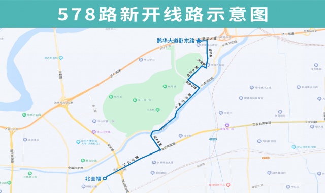 济南公交工作人员介绍,578路由鹊华大道卧东路开往北全福,主要途经鹊华大道、听水路、洪园路、光华大道、卧牛山路、小清河北路、还乡中路、工业北路,沿途设置鹊华大道卧东路、鹊华大道听水路(路北)、听水路海门路、听水路光华大道、听水路洪园路、卧牛山路光华大道(路南)、光华大道卧牛山路(路东)、卧牛山路小清河北路、小清河北路奥体西路、还乡店公园、齐鲁制药(路北)、还乡店路工业北路(路东)、工业北路电建路、全福立交桥东、桑园北社区(路南)、全福立交桥、全福立交桥西、北全福(路南)公交站点。