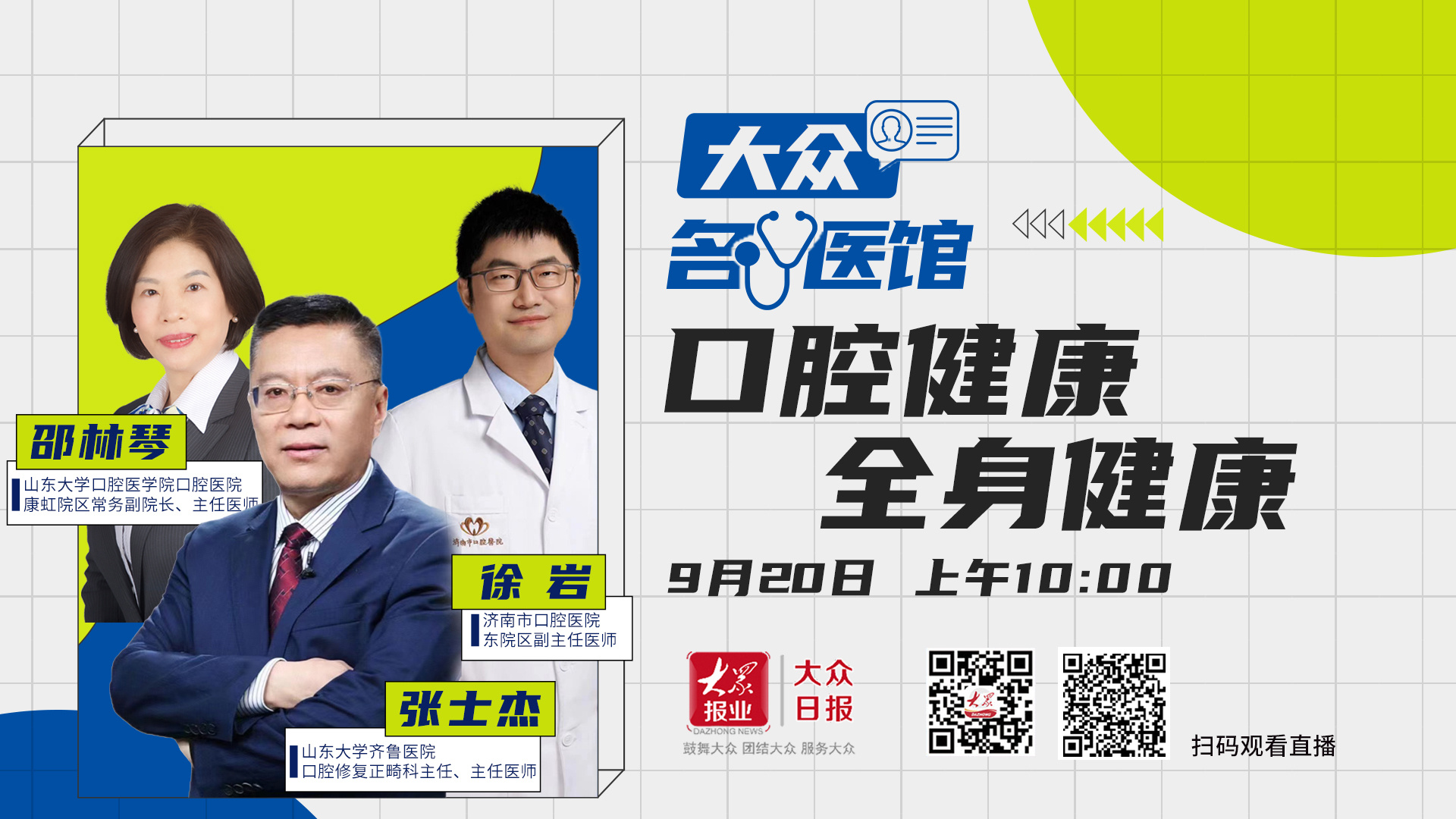 9月20日上午10:00,山东大学齐鲁医院口腔修复正畸科主任、主任医师张士杰,山东大学口腔医学院口腔医院康虹院区常务副院长邵林琴,济南市口腔医院东院区副主任医师徐岩做客《大众名医馆》爱牙日沙龙,为我们介绍口腔健康知识。