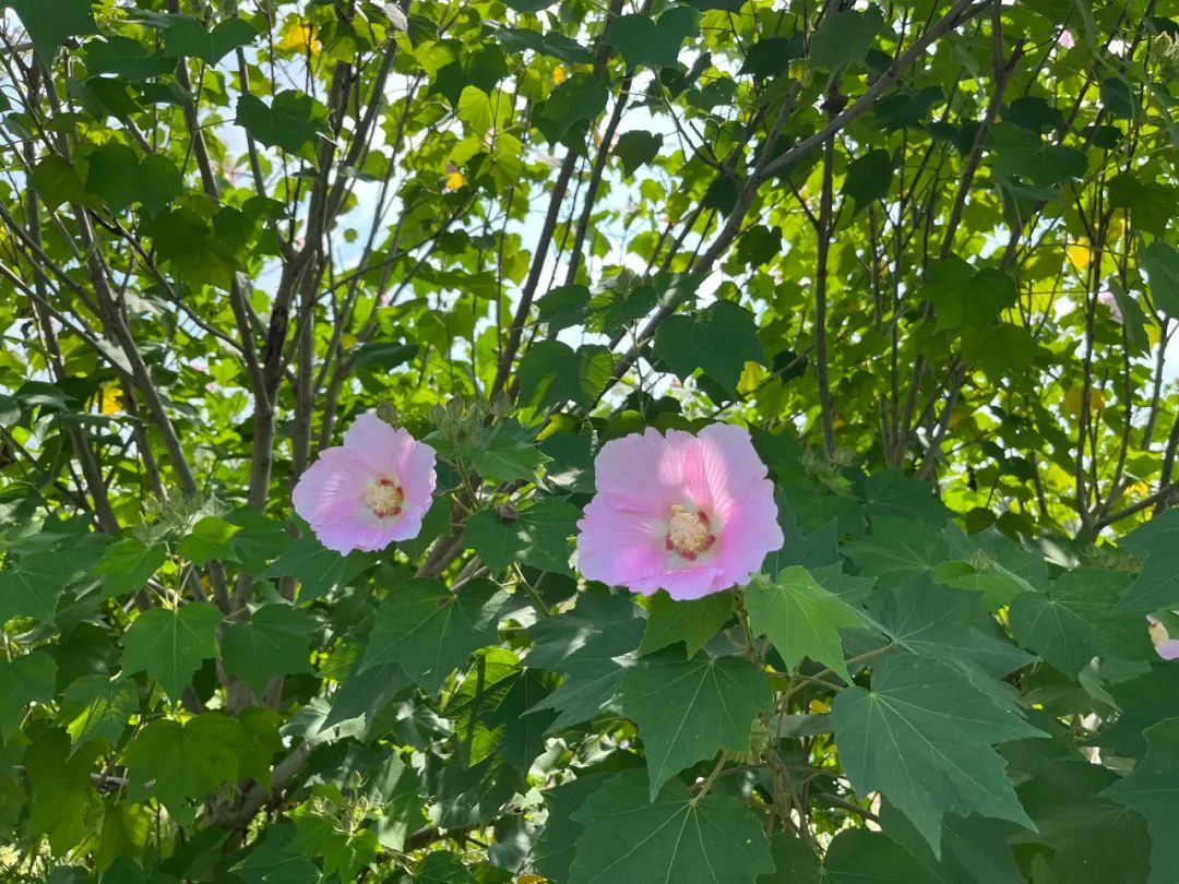 而一旁的粉色木芙蓉星星点点开放,点缀在一片秋日芒草中。