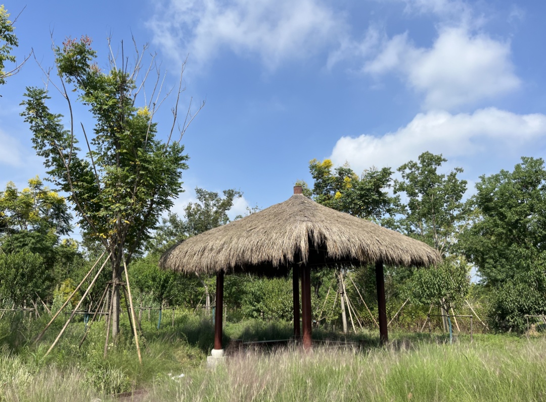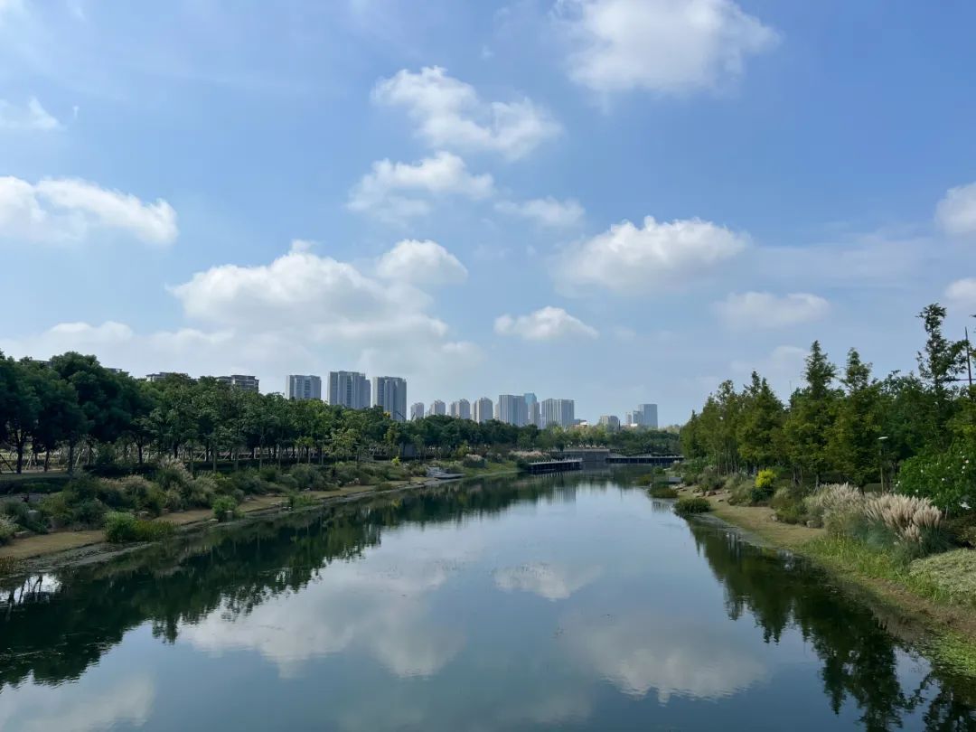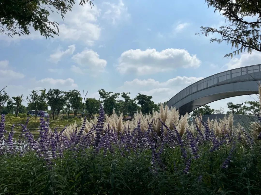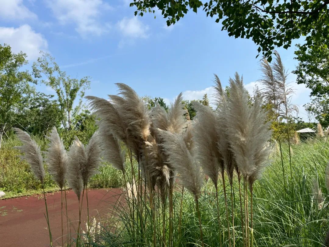 在奉贤新城的南上海中央公园,蓝天、白云和芒草、蒲苇也勾勒出一幅初秋的画卷,绒绒的长穗随风摇曳。