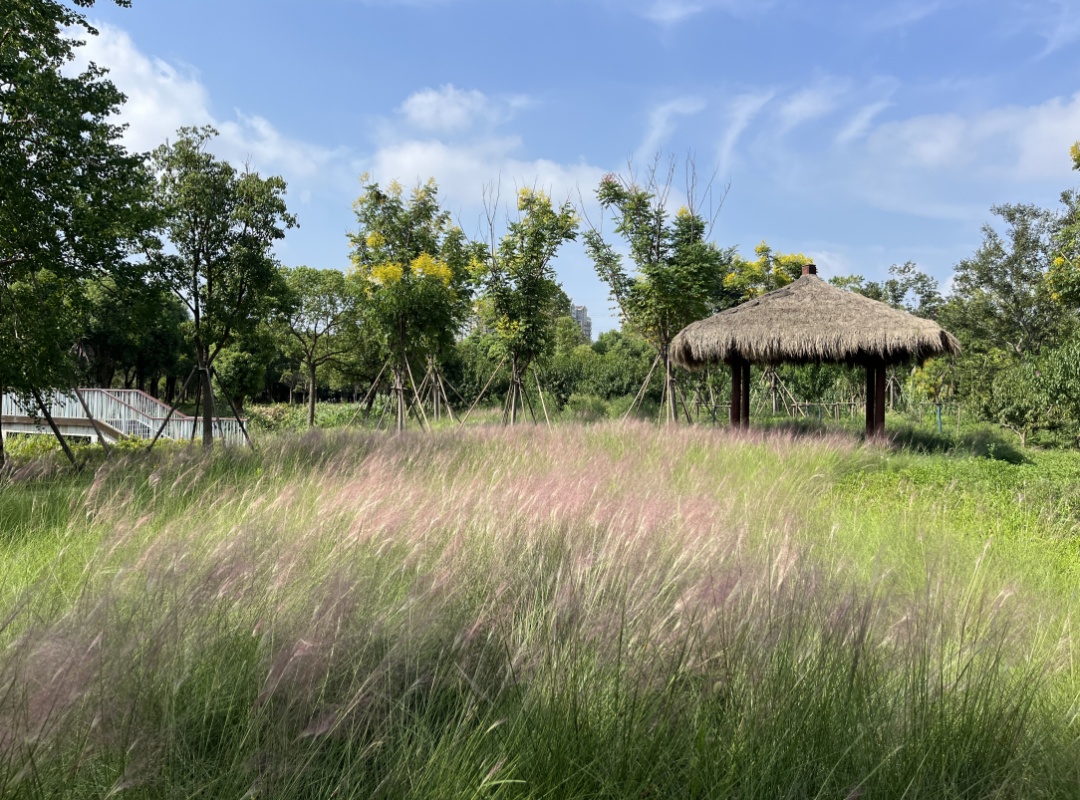 一旁的粉黛乱子草也开始进入花期,渐渐长出了粉色云雾状花,但目前还未正式进入盛花期,预计在9月下旬至10月上旬能够达到最佳观赏效果。