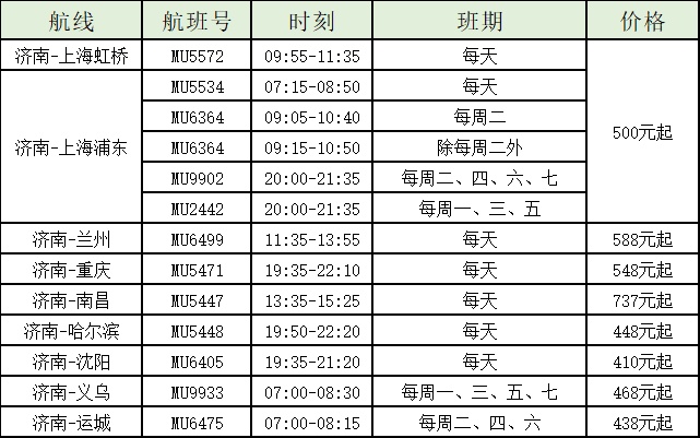 目前,东航济南出港航线包括济南-上海、济南-昆明、济南-武汉、济南-西安、济南-兰州、济南-重庆、济南-南昌、济南-哈尔滨、济南-沈阳、济南-义乌、济南-运城、济南-广州等。其中,以下航线还有优惠价,供旅客选择购买:
