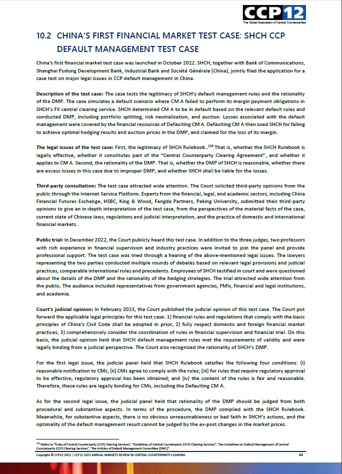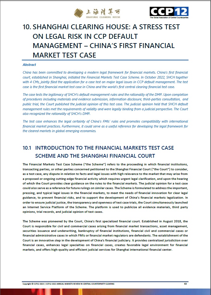 近日,全球中央对手方协会(CCP12)发布《2022年度市场报告》,其中专题介绍上海金融法院审结的全球首例涉及中央对手方违约处置的测试案例。该案例成为我国首个入选该协会的年度案例。