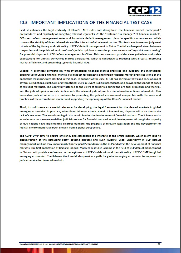 CCP12对此给予高度评价,认为本次案例测试提升了中国金融基础设施规则的法律确定性,强化了市场参与方风险预判与防范能力,有利于防范化解系统性金融风险。同时,CCP12肯定了本次案例测试对司法兼容金融市场国际惯例的推动促进,认为有利于保障中国金融市场制度型开放。此外,CCP12称赞本次案例测试为全球新兴的集中清算市场法治化建设提供了有益参考,金融市场案例测试机制本身亦可为全球新兴市场拓展完善金融司法服务保障功能提供可借鉴的路径。