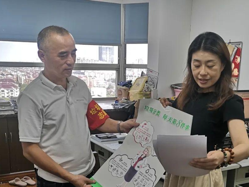 在各社区物业公司、舜浦大楼、仁瑞护理院等,一线物业人员、工作人员经过专题培训后,每日定点巡查,发现问题及时整改。同时,通过发放垃圾分类宣传资料、张贴宣传海报、规范分类检查上墙制度,自觉成为垃圾分类工作的实践者、宣传者、倡导者、推广者。