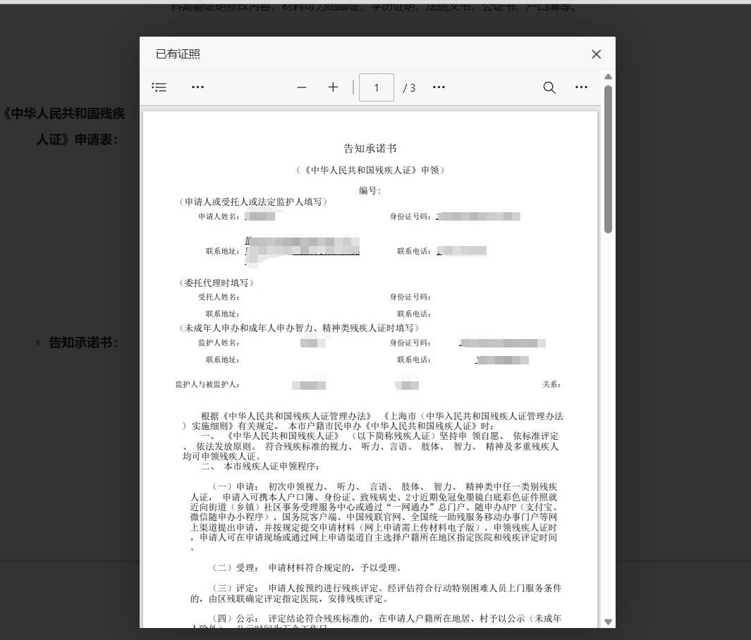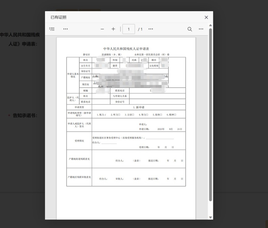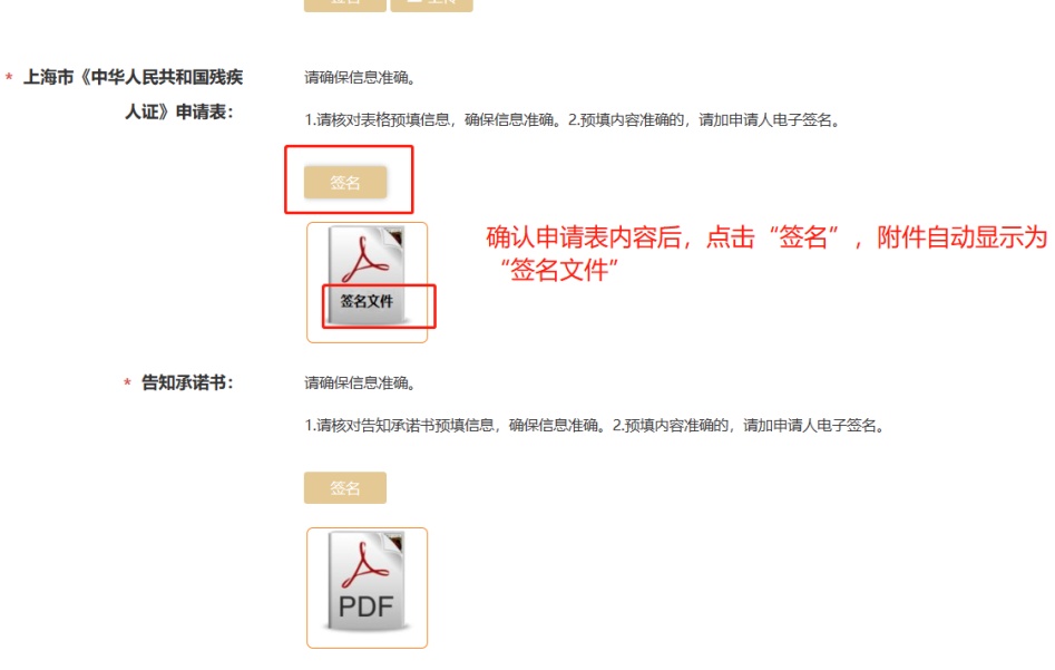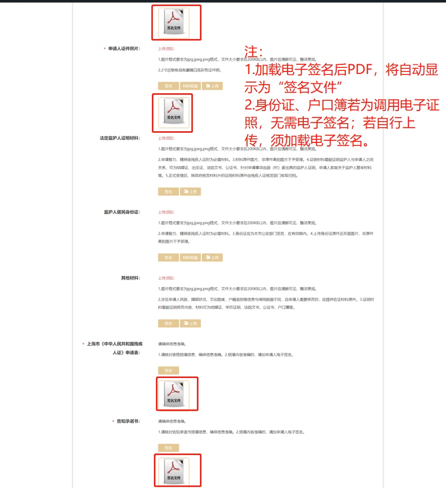 5.上海市《中华人民共和国残疾人证》申请表、告知承诺书为系统生成材料,可点击PDF材料左下角“放大”键预览并确认相关信息,加载签名后上传。