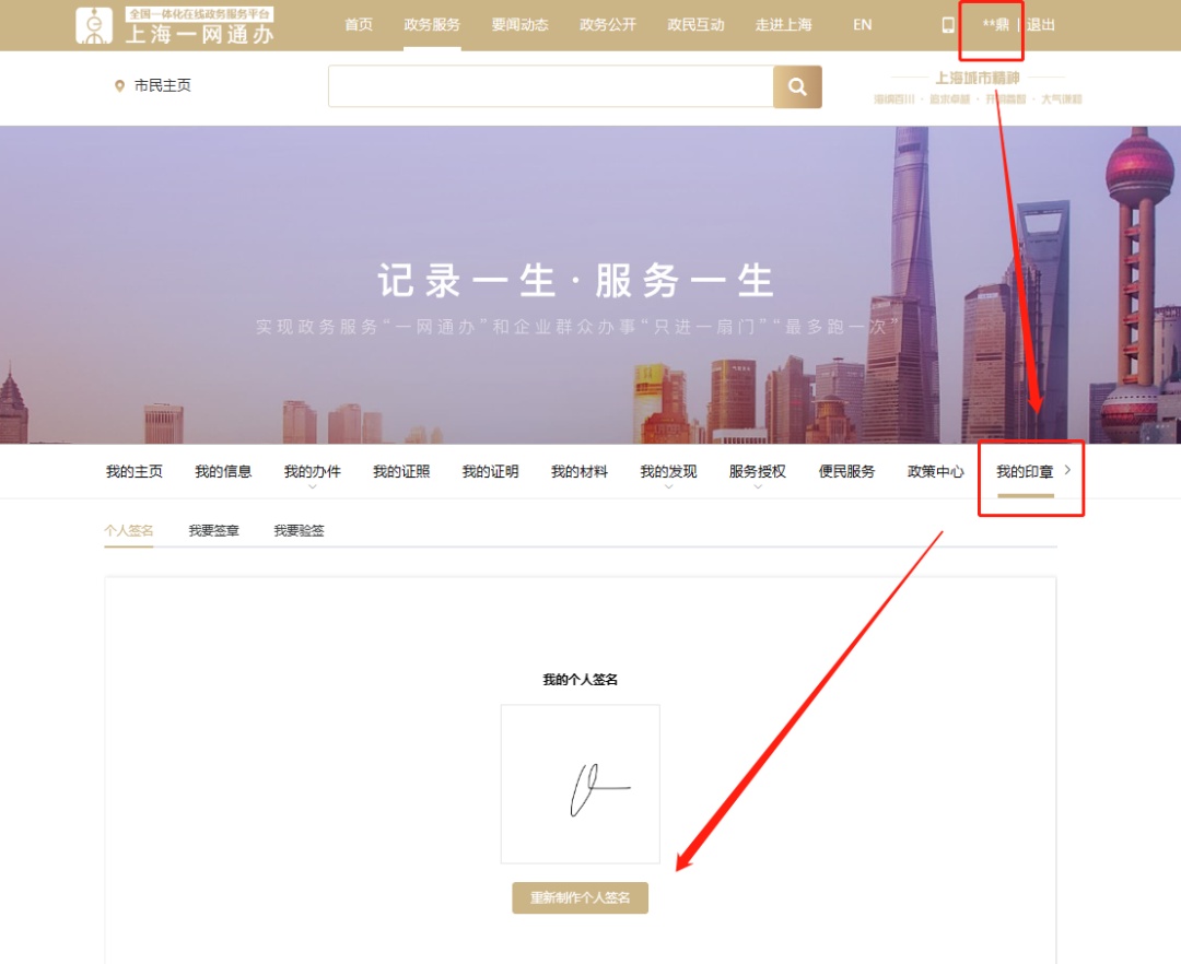 2.“材料校验”为OCR校验,材料上传后点击“材料校验”系统自动完成;“签名”为加载申请人“电子签名”,可在一网通办“个人主页、我的印章”中制作(如下图)。