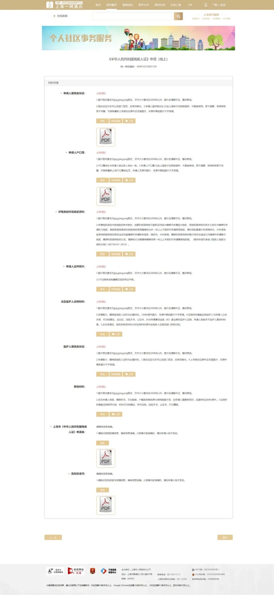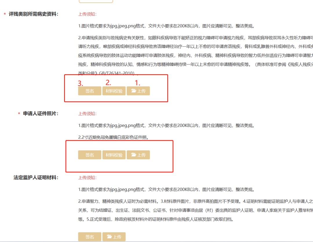 小编提醒:1.标注“*”的申请材料为必需材料,无材料不可提交。智力、精神残疾类别申请的,监护人居民身份证、法定监护人证明材料则必须上传。