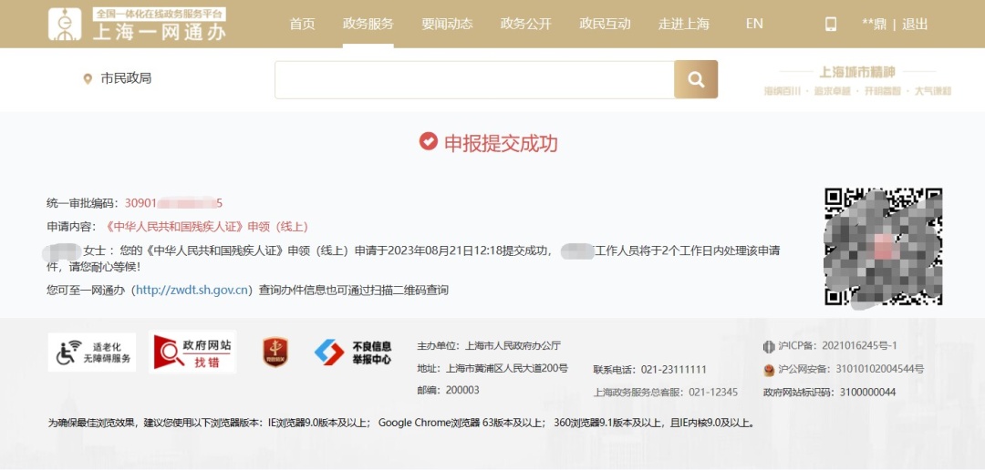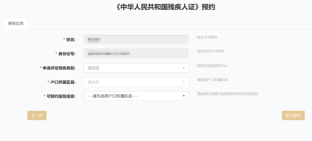 收到预审通过短信后,可通过“一网通办”门户网站PC端,进入申领事项,点击《中华人民共和国残疾人证》预约,根据申请残疾类别,在显示的“可预约医院信息”范围自行选择,并“提交预约”。
