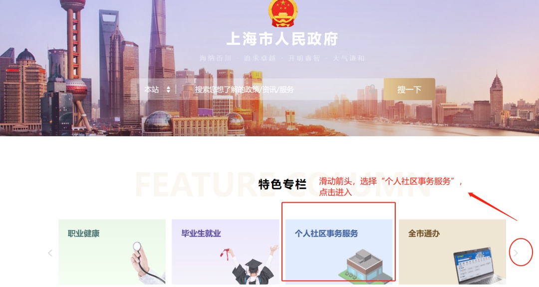 第一步:打开网址https://zwdt.sh.gov.cn/govPortals/index.do,在“政务服务”页面的“特色专栏”中选择“个人社区事务服务”,找到“《中华人民共和国残疾人证》申领”,点击“立即办理”。