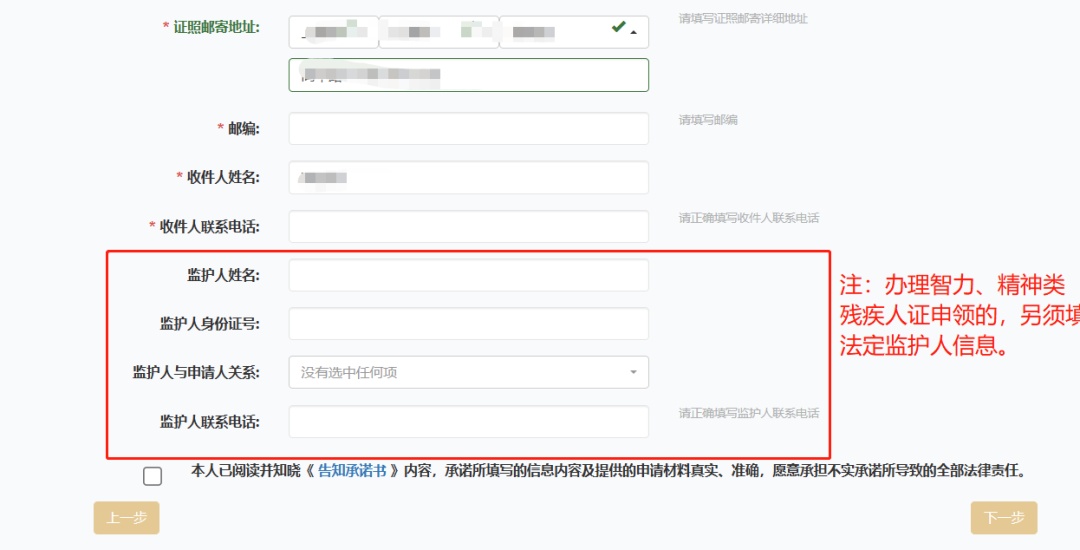 第四步:继续填报申请人信息。申领智力、精神类别残疾人证时,还须填报监护人相关信息,包括监护人姓名、身份证号、监护人与申请人的关系。