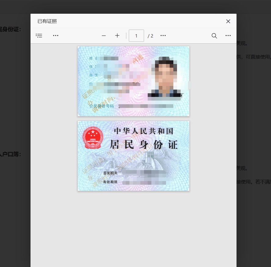 3.申请人居民身份证、户口簿已调用电子证照,PDF左下角“放大”键可查看调取的电子证照(如下图)。若不同意电子证照调取或调取电子证照内容有错漏的,可按上传须知要求拍照上传或图片上传,上传的图片须通过OCR校验,未通过校验的不可提交办件。