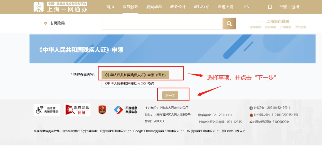 第二步:申请人实名登录,进入事项,选择办事内容为“《中华人民共和国残疾人证》申领(线上)”,点击“下一步”;