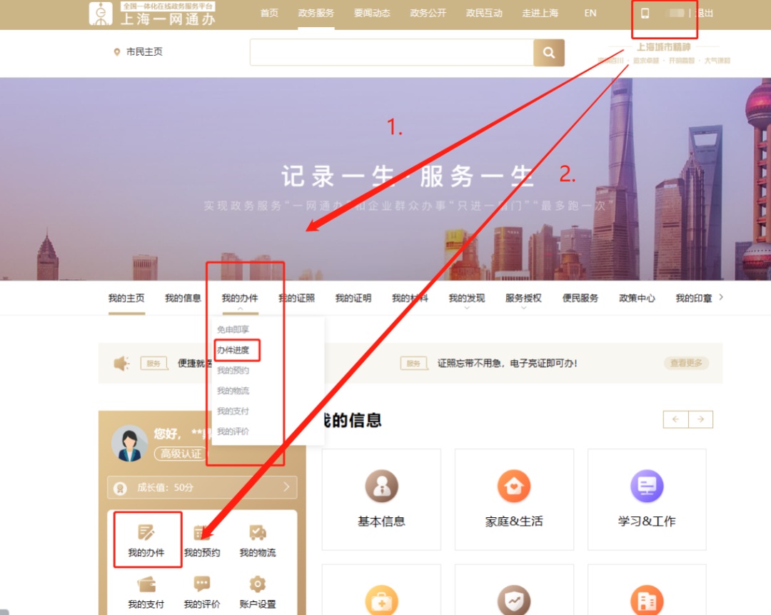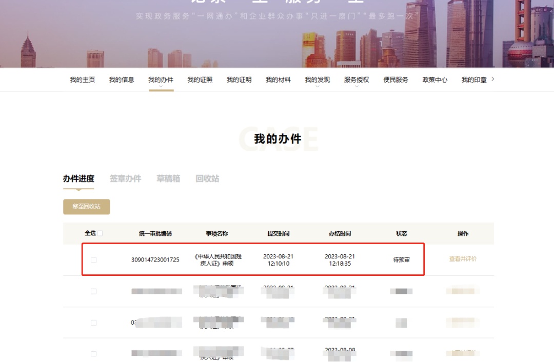 申请人如需网上办理,可通过“一网通办”门户网站PC端进入个人主页,选择“我的办件”查看办件进度。