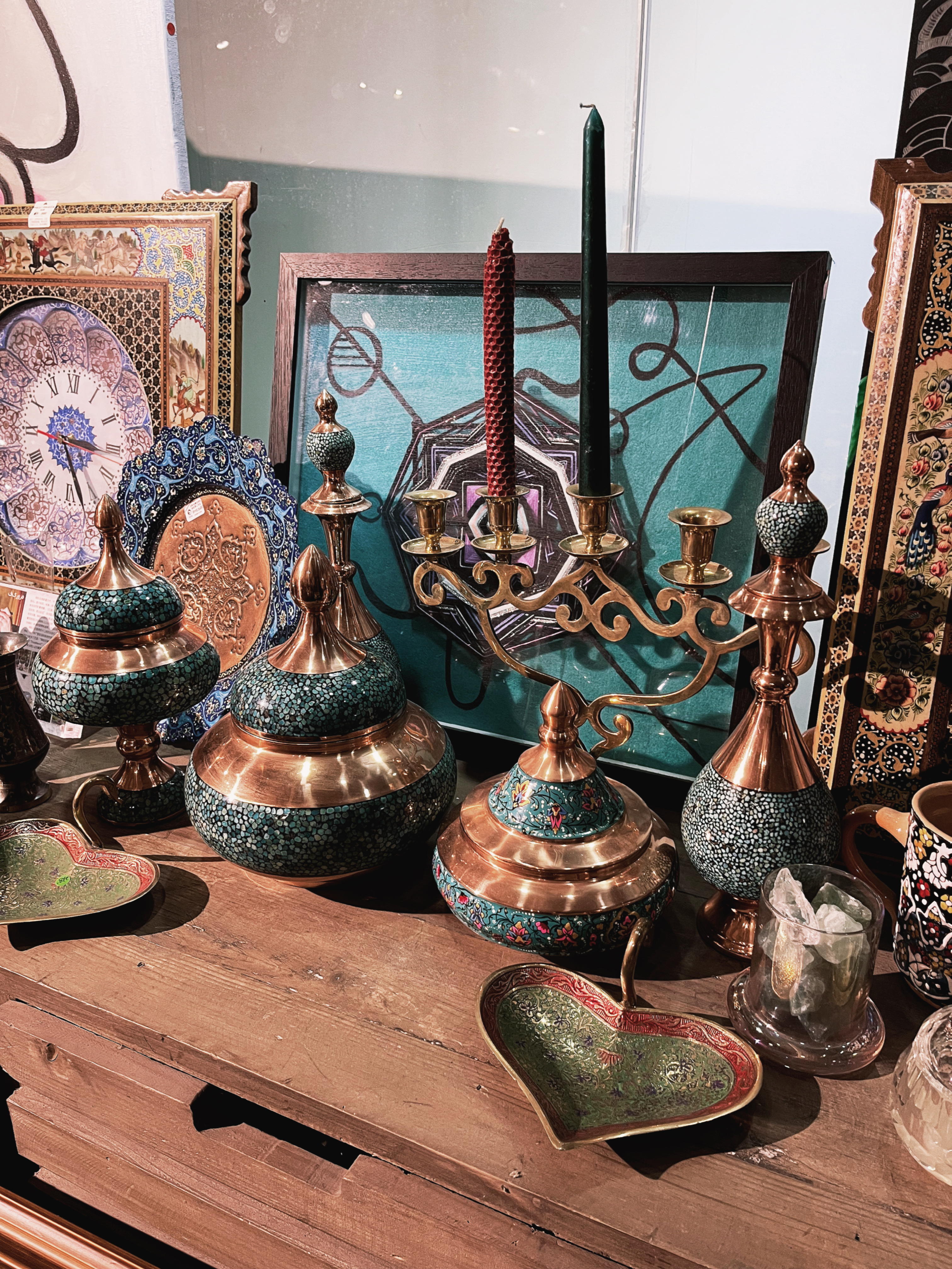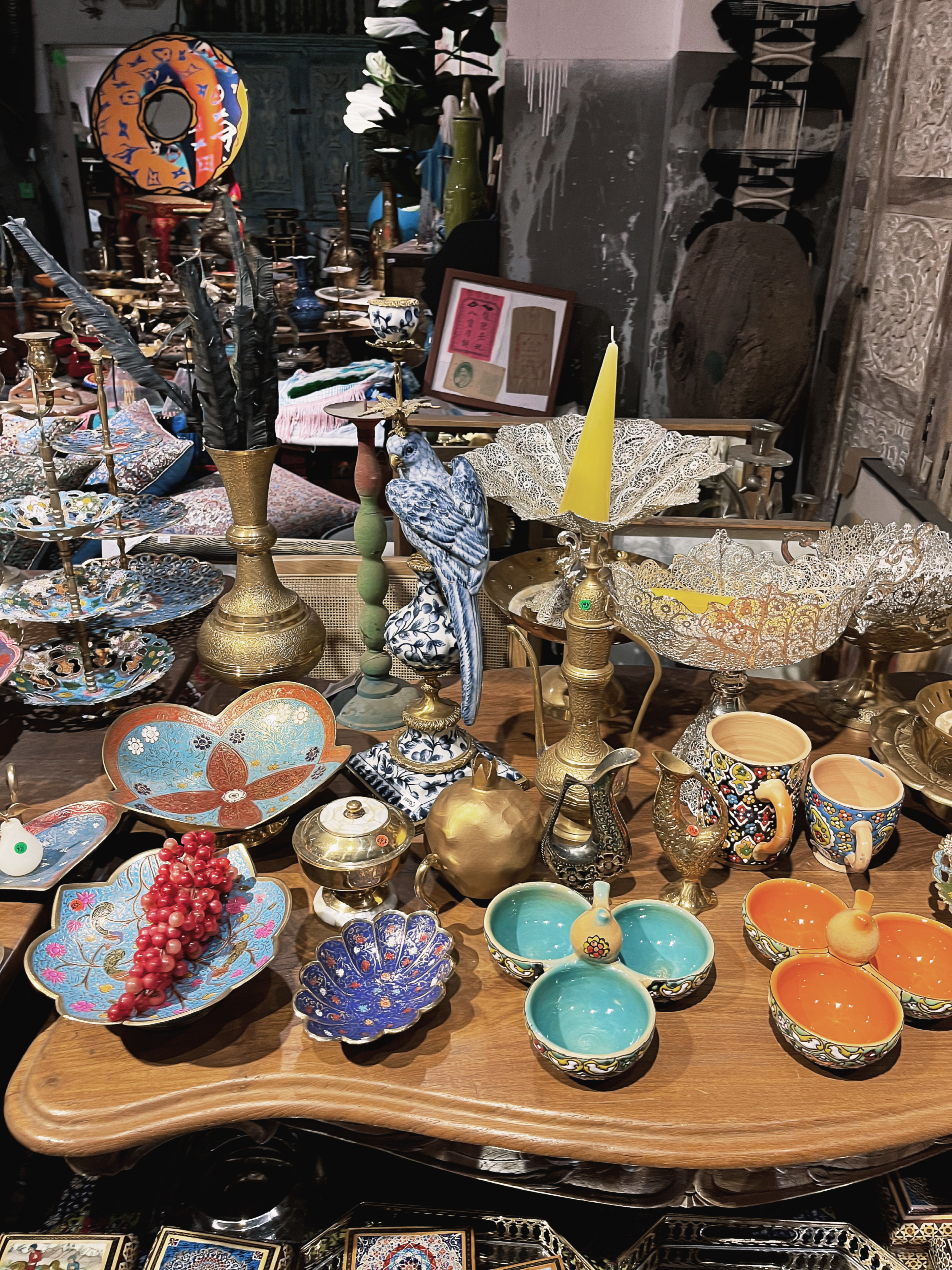 但这些Vintage物件却有许多故事——桌上堆着的造型别致的潮玩手办可能来自某个国际知名设计师的手笔;多巴胺配色的餐具可能是店主从中东、西亚或者摩洛哥收集来的;悬挂的毛毯和地毯可能是某个小众艺术插画家作品……